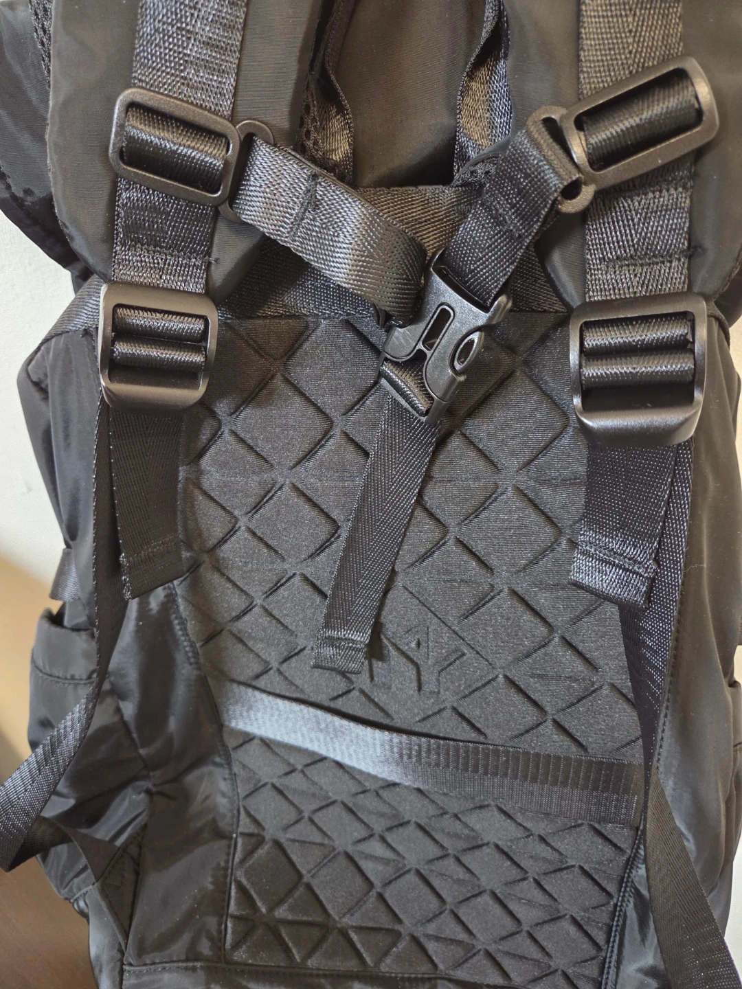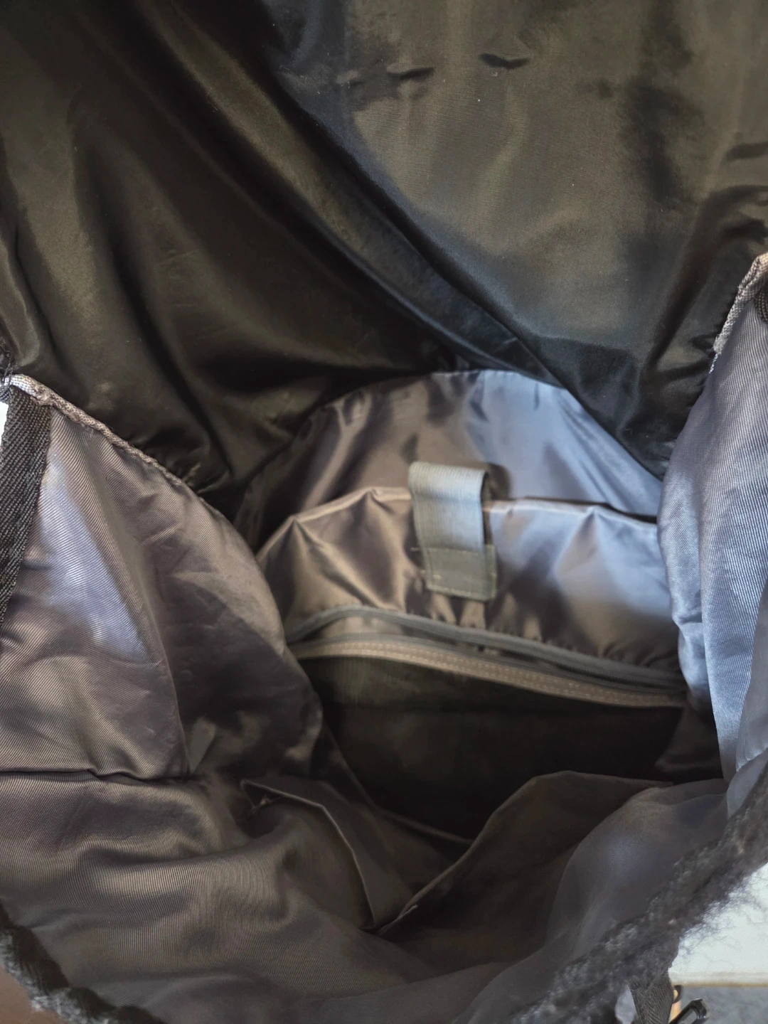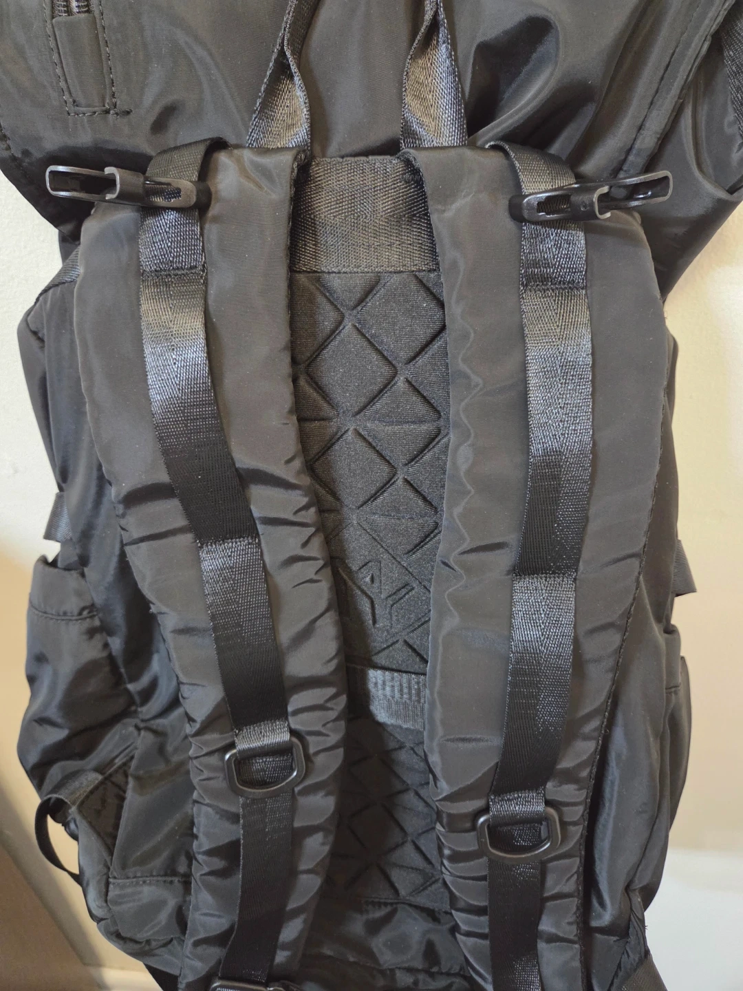 This black backpack is made of durable nylon. It features multiple pockets and adjustable straps for comfort. The interior has a padded compartment for a laptop. It's a great everyday bag for school or travel!