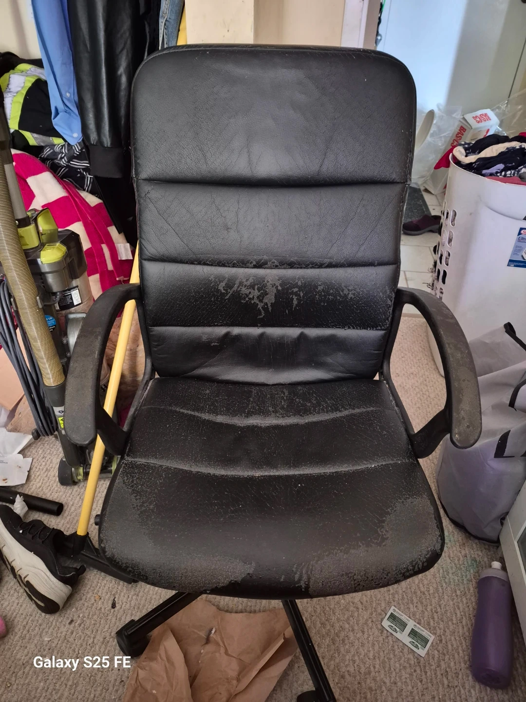 This is a black office chair with faux leather upholstery. It shows signs of wear on the seat and backrest, with some peeling. The chair has a wheeled base for easy mobility.
