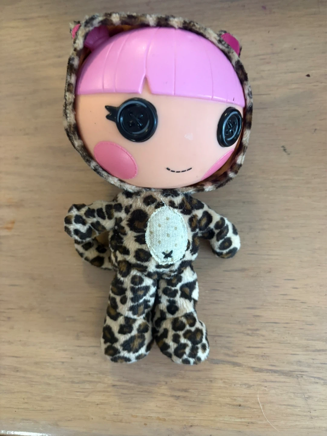 This is a Lalaloopsy doll with pink hair and button eyes. It's wearing a hooded leopard print outfit with pink accents. The doll has a fabric body with a decorative patch on the chest.