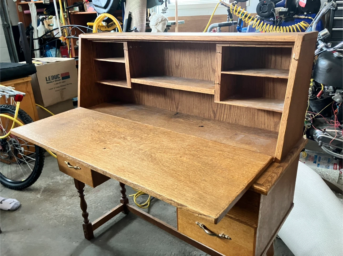 This vintage secretary desk features a fold-down writing surface and a hutch with shelves. It's made of oak wood and has several drawers for storage. The hutch provides organizational space.