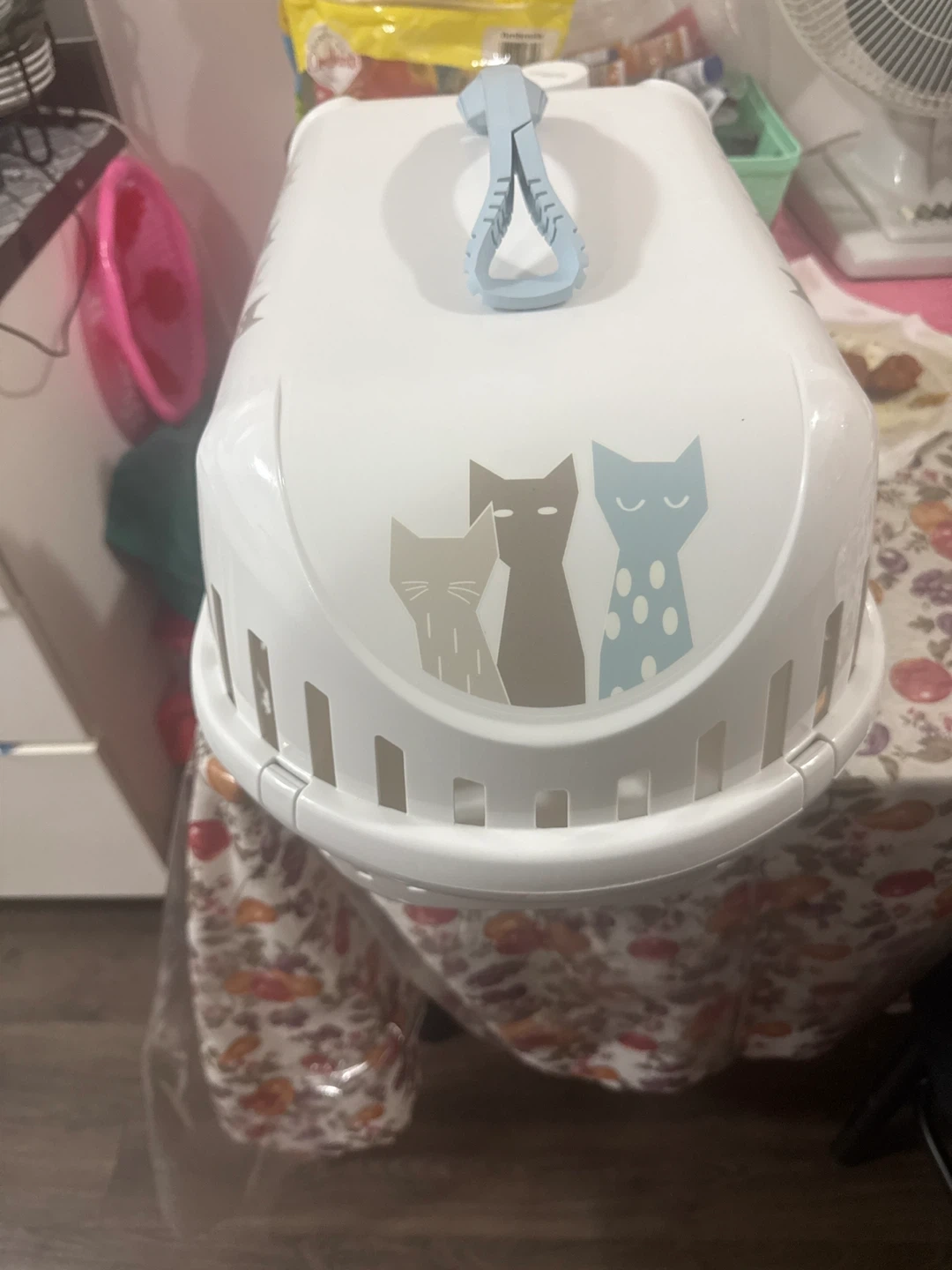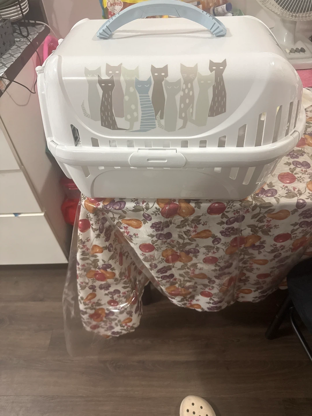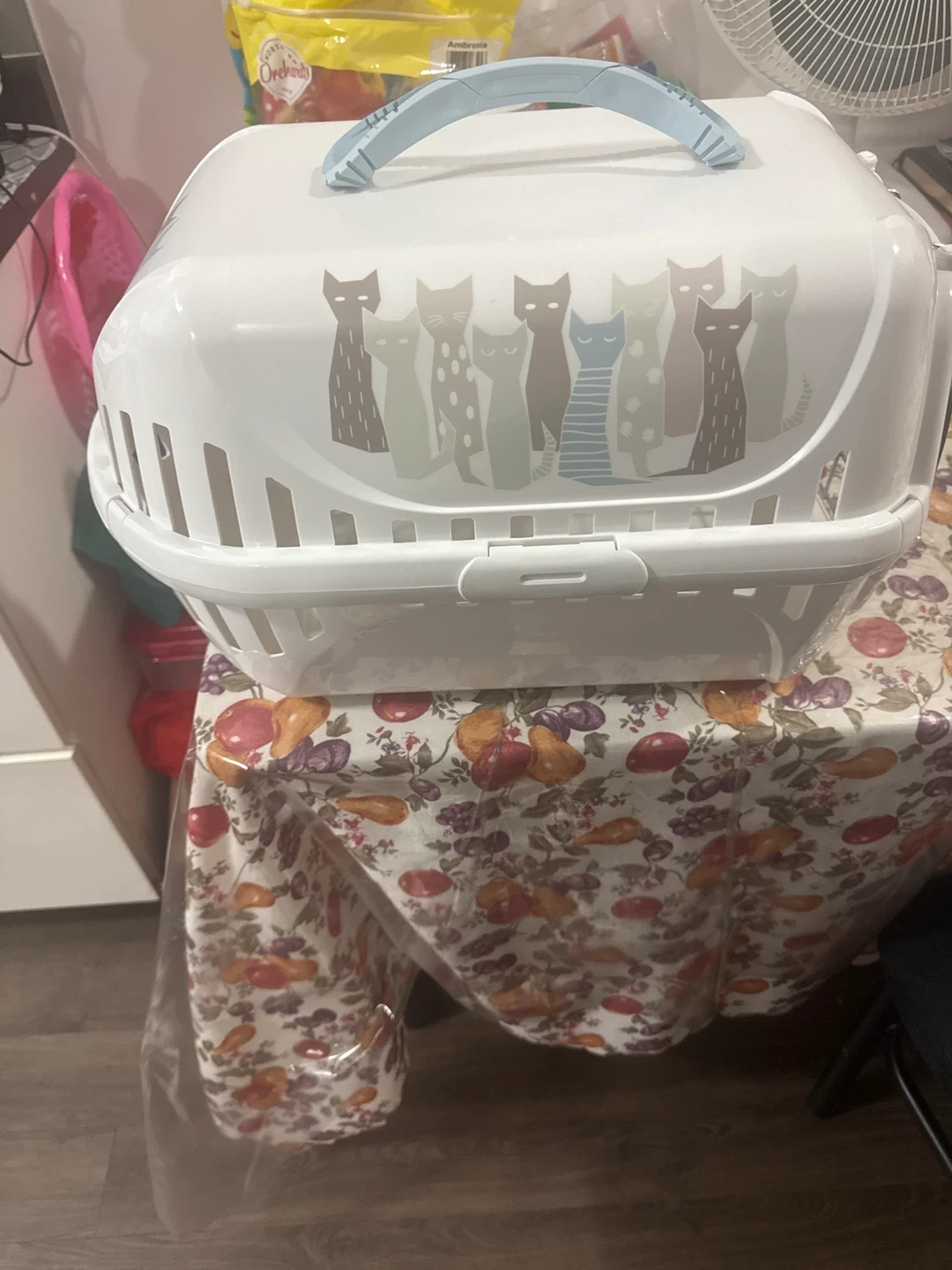 Selling a Moderna cat carrier in great condition! It's white with cute cat designs on the side. Perfect for vet visits or travel
