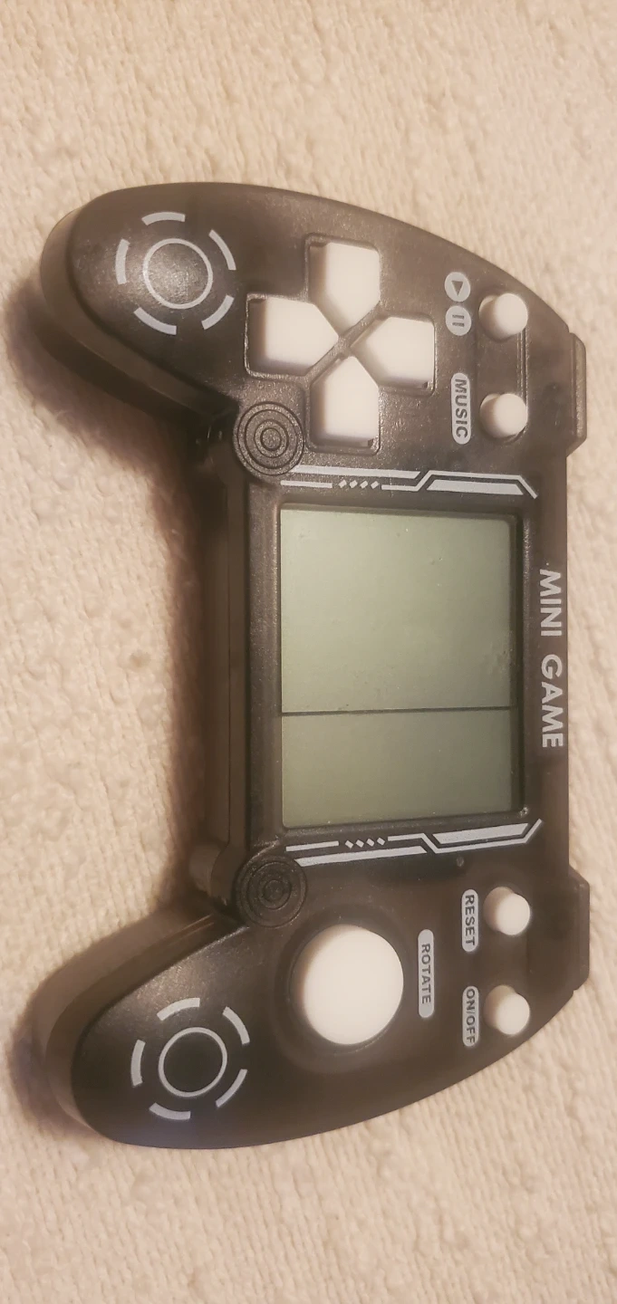 Selling a mini game handheld console. It's black and shaped like a game controller with a small screen in the middle. It has buttons for music, reset, on/off, and rotate. Perfect for a bit of retro fun!