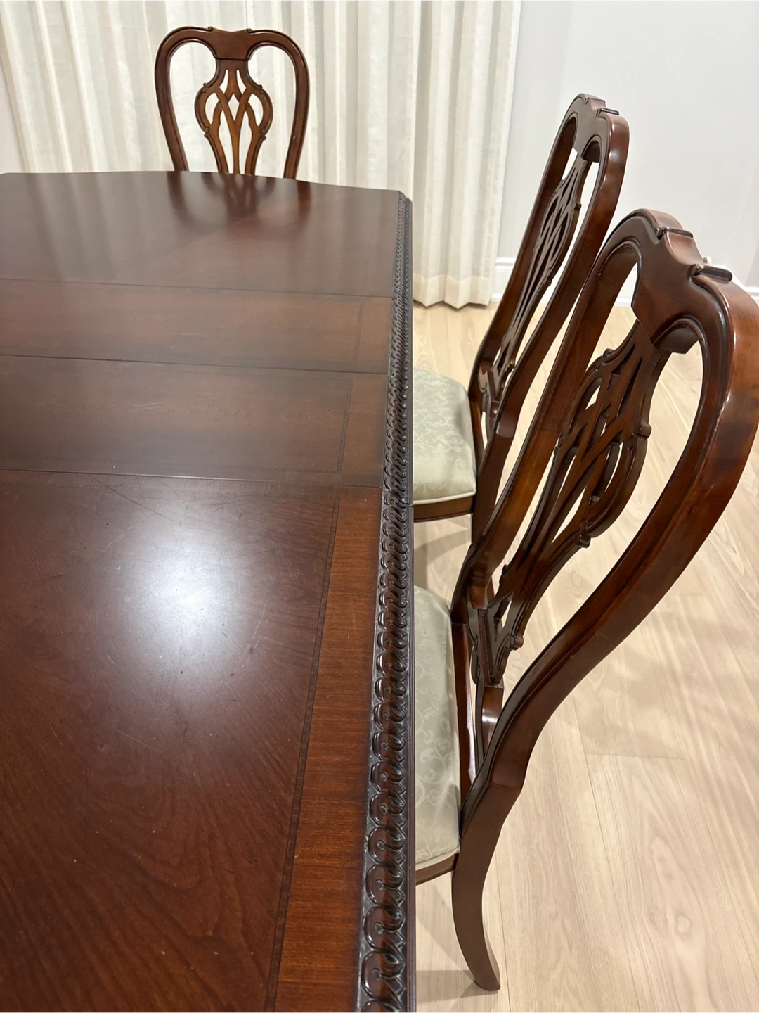 A beautiful wooden dining table set that includes six chairs. This set features intricate carvings on the table and chair legs. The chair seats are upholstered in a light, patterned fabric. It's perfect for family dinners and hosting guests!