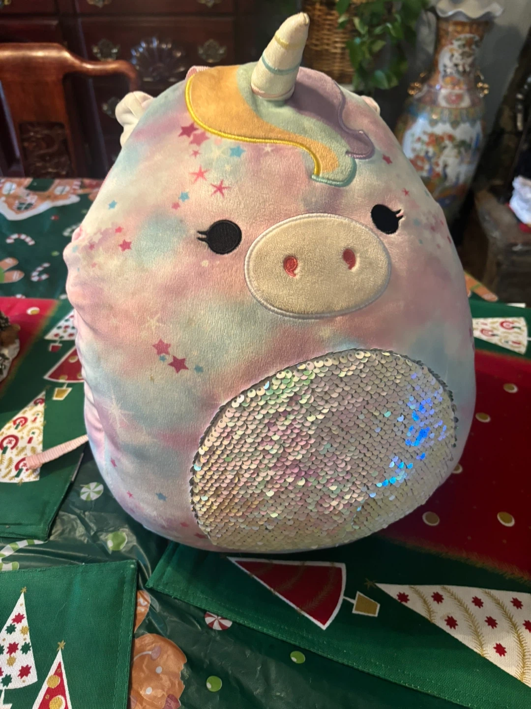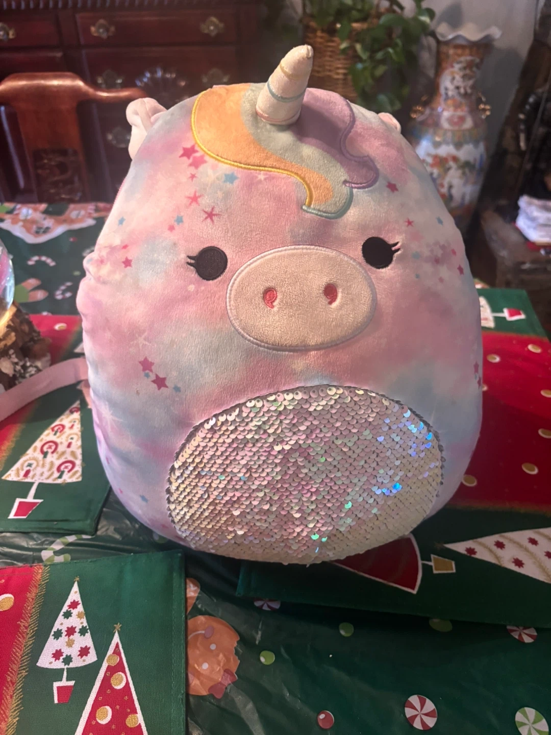 This is a super cute Squishmallows unicorn backpack! It's in great condition and ready for a new owner. Perfect for carrying your essentials in style!