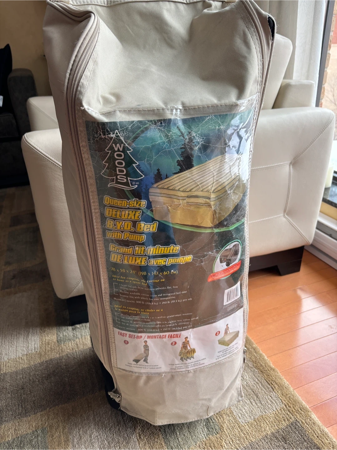 This Woods Queen Deluxe is designed for camping or as a spare bed at home. It also includes a storage bag with wheels for easy transport. Supportive up to 500 lbs. Does NOT include the pump and reflected in low asking price. It measures 78 x 58 x 24 inch’s. In good condition and clean.