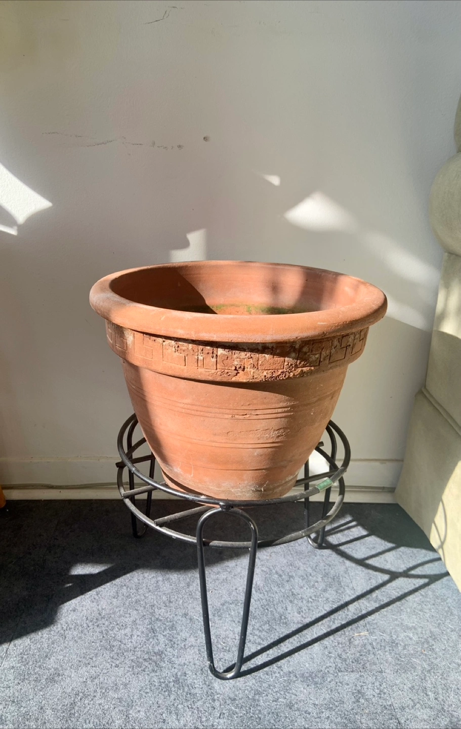 A large terracotta planter with a decorative rim.