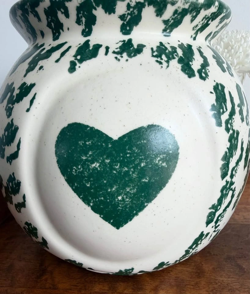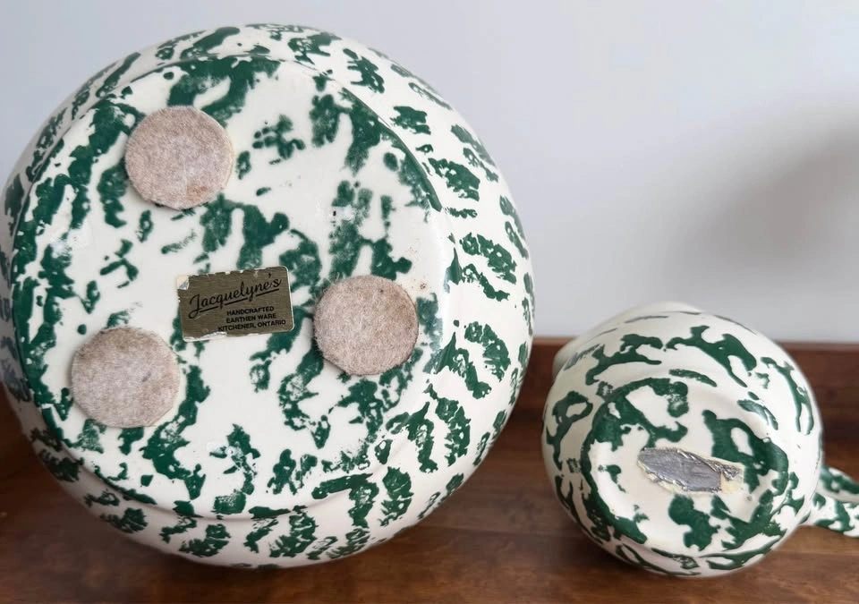 Hand-crafted spongeware set from Jacquelyne's in Kitchener, Ontario. Features a heart on the lidded jar with a matching pitcher. Green and cream tones. Jar is 7 x 8 inches. Pitcher is 6 x 4.5 inches. Great condition. Sold as a set. Pickup in Keswick or Newmarket.