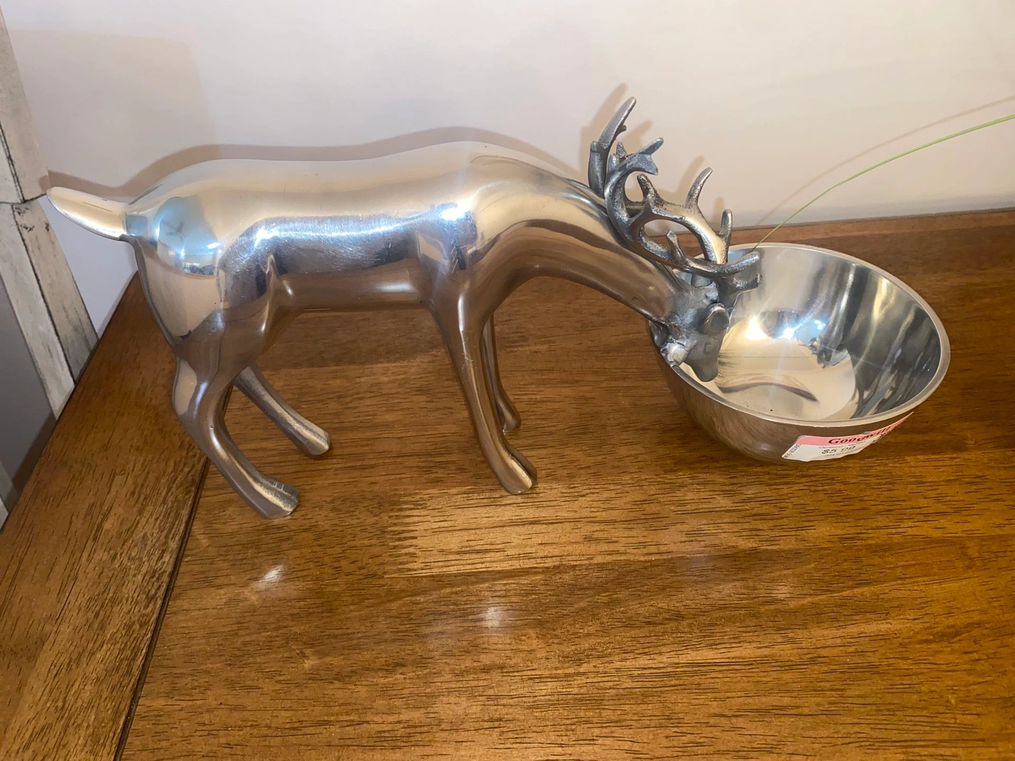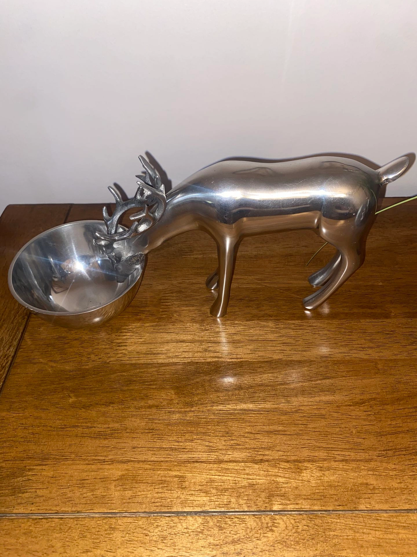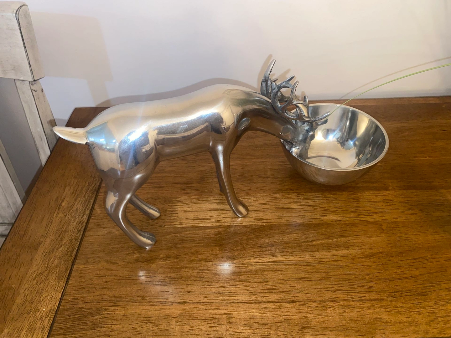 Aspen Metal Figural Stag Deer Snack Nut Bowl or Candy Dish. Crafted in India with a polished finish, this silver bowl features a beautifully designed stag and deer figurine that will complement any decor. Measuring 6 inches in height, 13 inches in length, and 4 1/2 inches in width, this snack/candy bowl is perfect for serving your guests or as a gift. Clean with a dry cloth to maintain its shine for years to come. Pickup in Orland Park or Countryside.