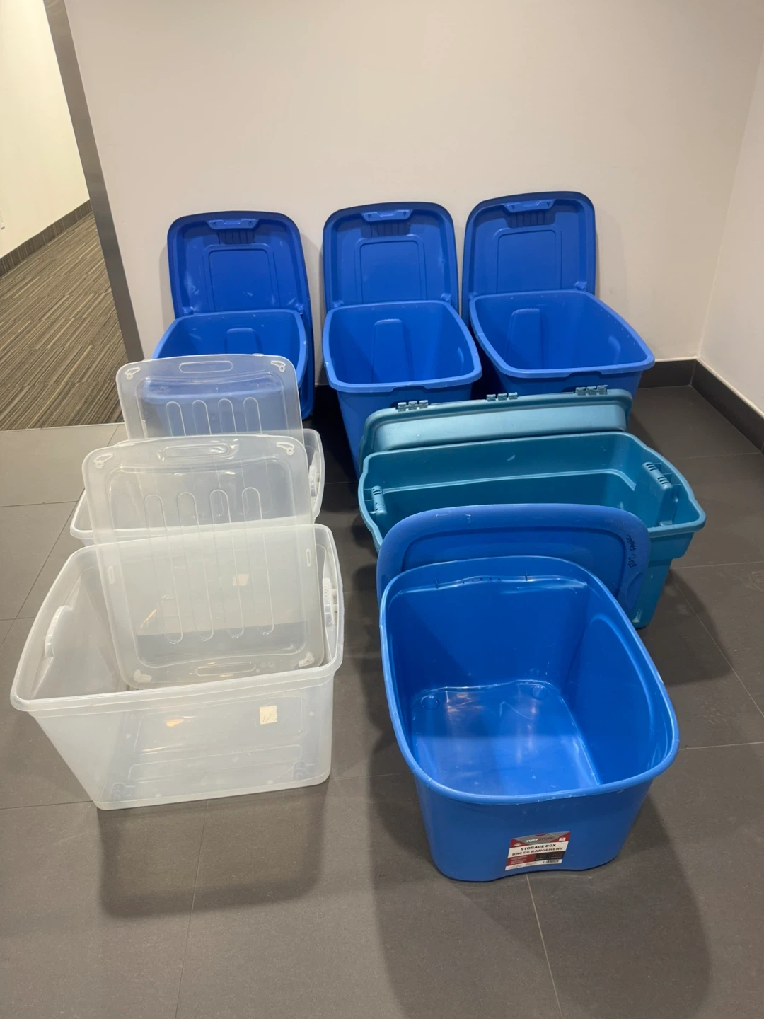 7 Large and X-Large Storage Tote Bins with Lids All for $30- Great as Moving Boxes or Spring Cleaning - all very Clean, mostly stored fabric and patterns and books - each one has been wiped out perfectly clean.
