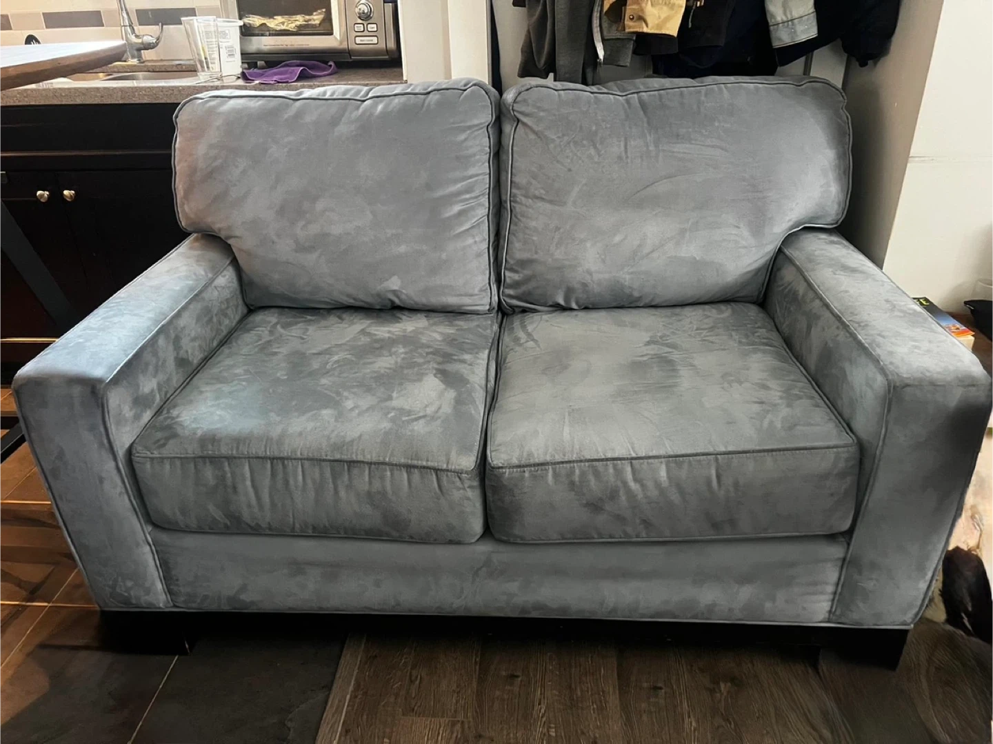 Comfortable 2-seater grey sofa with plush, supportive cushions and velour-feel material (unsure what the exact material is).