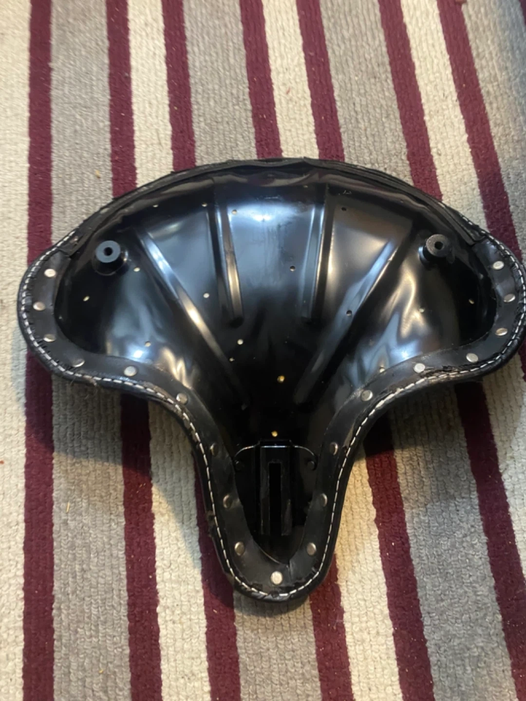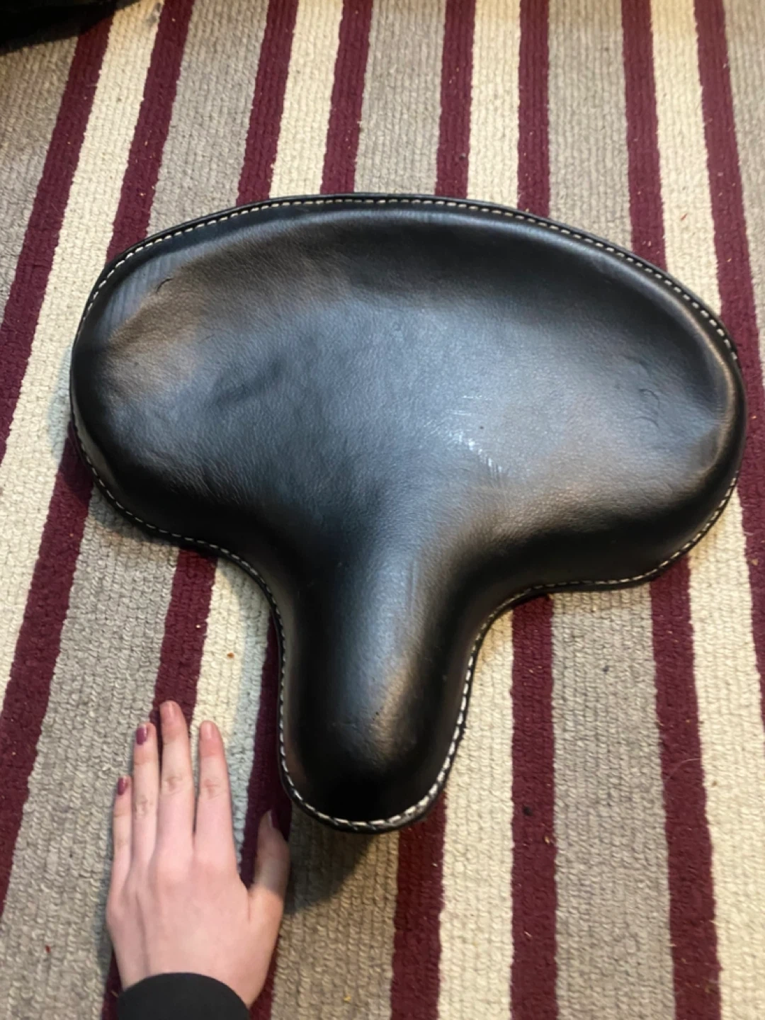 A classic black bicycle saddle seat. This seat is designed for comfort and durability. It's made from synthetic leather and features white stitching detail. Mounts to most standard seat posts.
