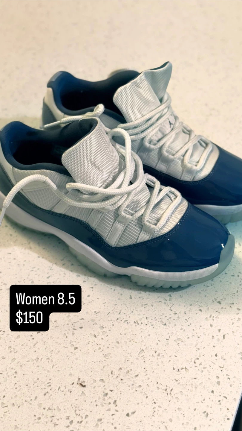 These are Air Jordan 11 Retro sneakers in a women's size 8.5. They feature a white and navy colourway with a patent leather mudguard. The soles are translucent.