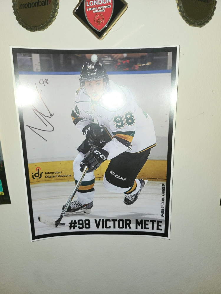 Signed photo of hockey player Victor Mete in his CCM jersey. Includes player name and number '#98 VICTOR METE'. Photo is taken by Claus Andersen.