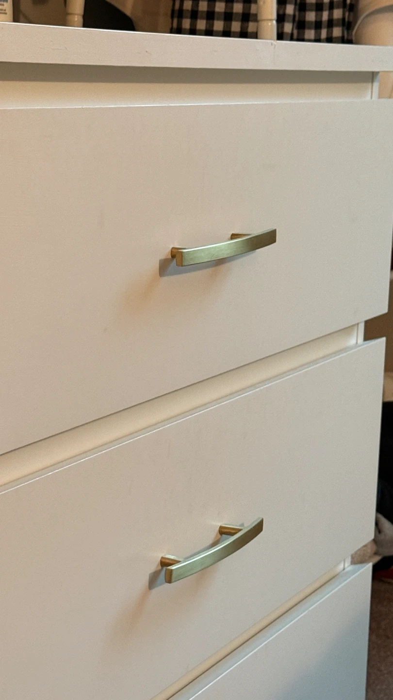 Two 3 drawer dressers, that you can put together to be a 6 drawer dresser. Add brushed gold drawer pull handles. Tons of storage!
