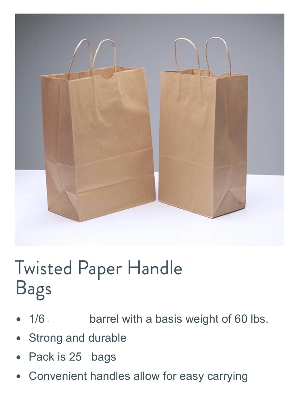 30 paper bags. They're made with twisted paper handles for easy carrying. These bags have a basis weight of 60 lbs. Handles are reinforced.