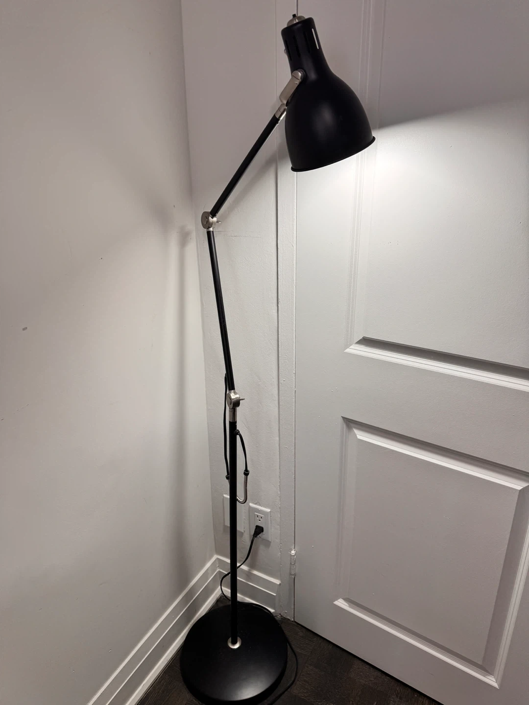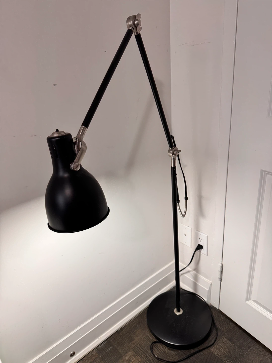 Adjustable black floor lamp with a metal shade. It has a flexible arm and a sturdy base for stability. This lamp is great for reading or task lighting.