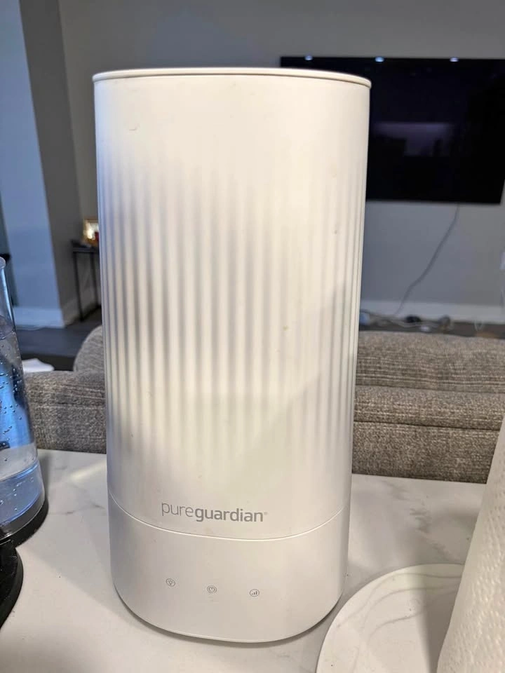 PureGuardian humidifier in white. Features a top-fill 1-gallon tank that runs up to 70 hours, perfect for medium to large rooms. Uses ultrasonic technology for quiet mist dispersal, offering relief from dry air. Easy to use with 3 mist speeds and a low water indicator. The 7-color nightlight adds a calming ambiance, great for kids' rooms or nurseries. Helps with colds, allergies, and dry skin. Compact design fits well on desks, nightstands, or in nurseries. Silver Clean Protection fights mold and mildew in the tank. You can add essential oils for aromatherapy. No pads or wicks to clean. Auto shut-off when empty.