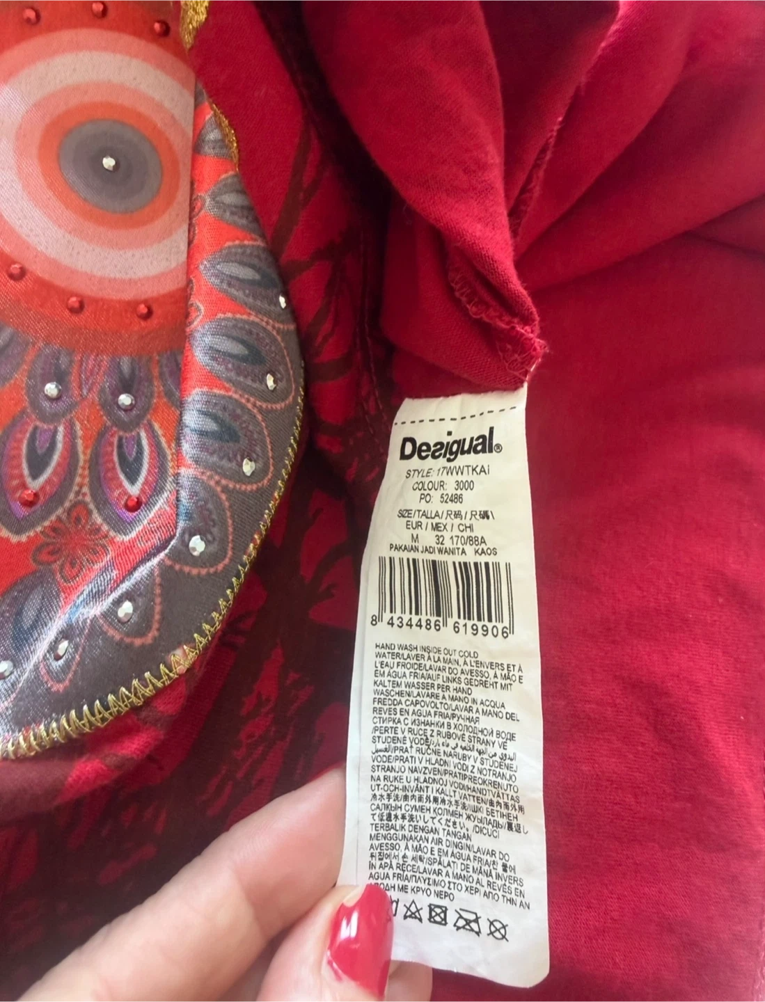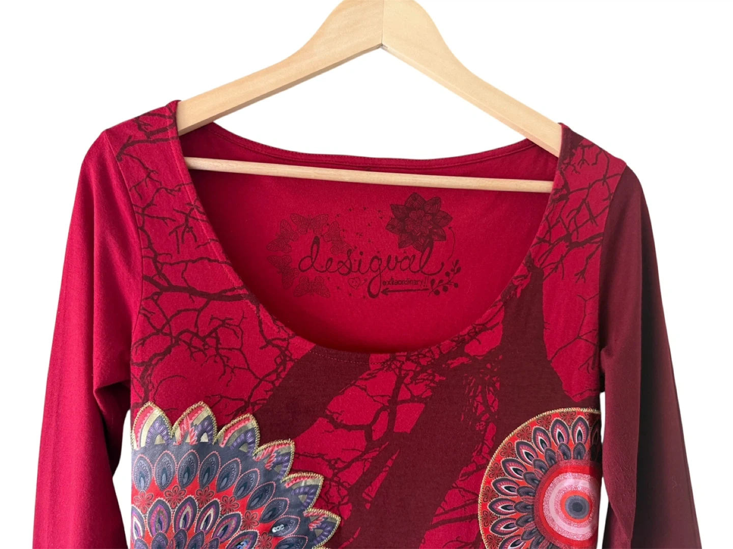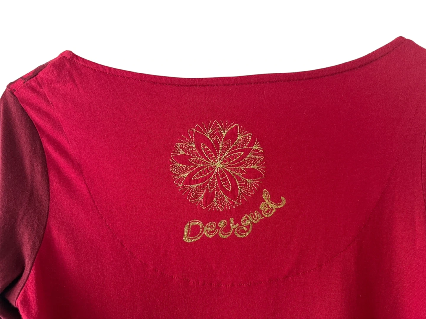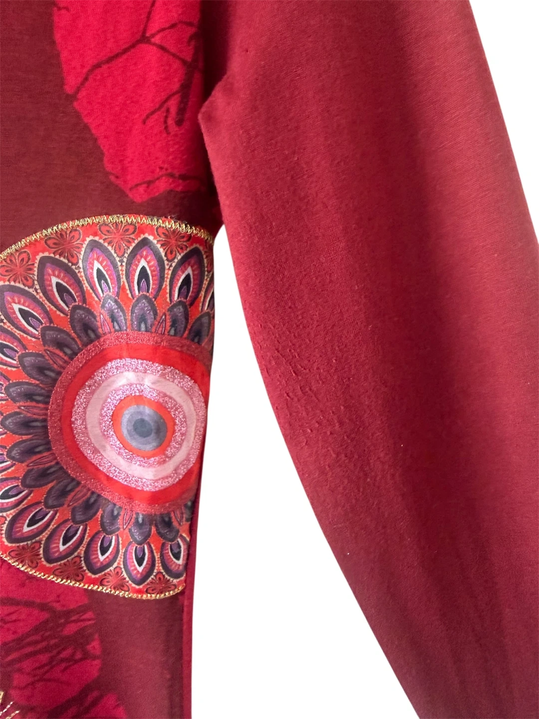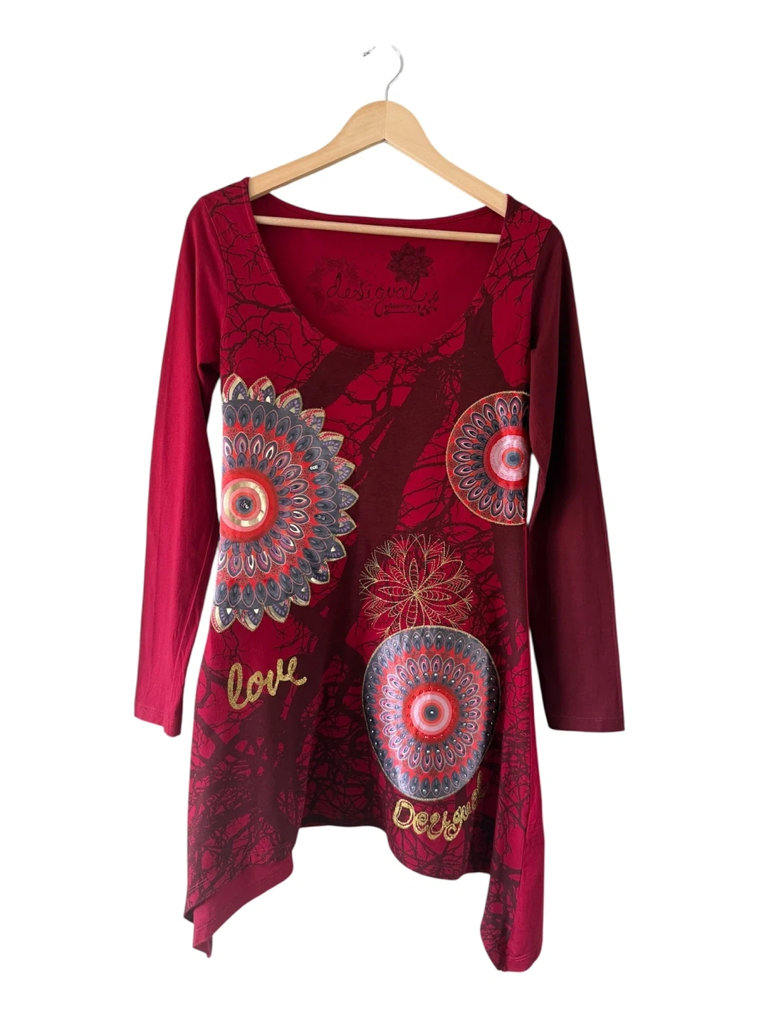 This Desigual long-sleeve tunic top is a vibrant red. It features a detailed mandala-style graphic patchwork with gold embroidery. The fabric shows some minor pilling on the sleeve, consistent with normal wear. Size M.