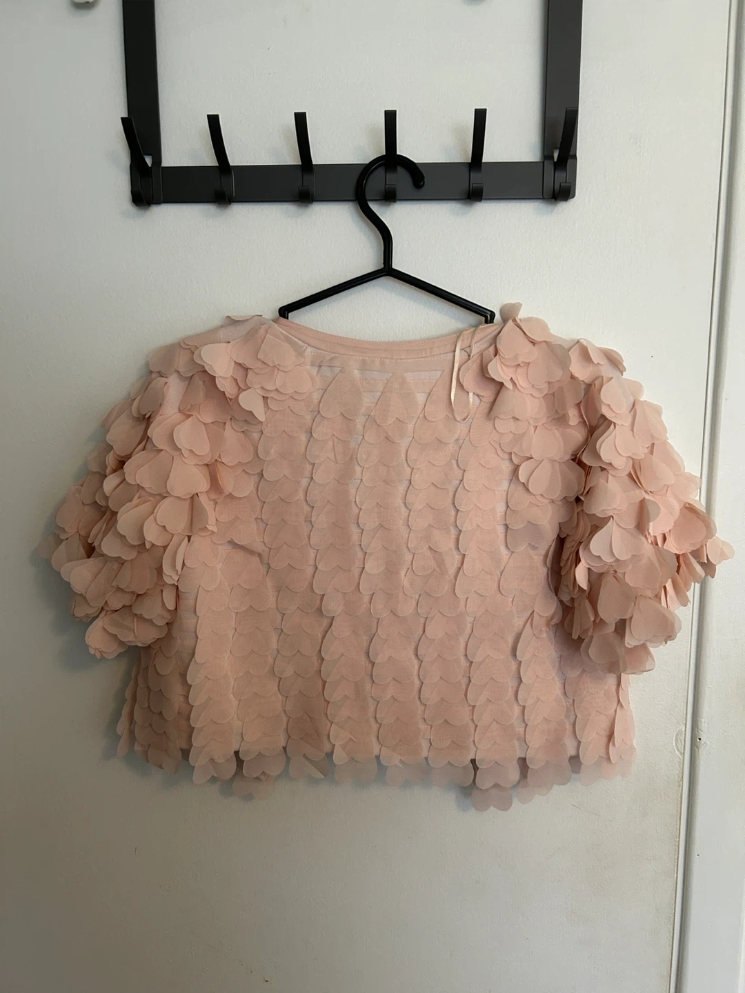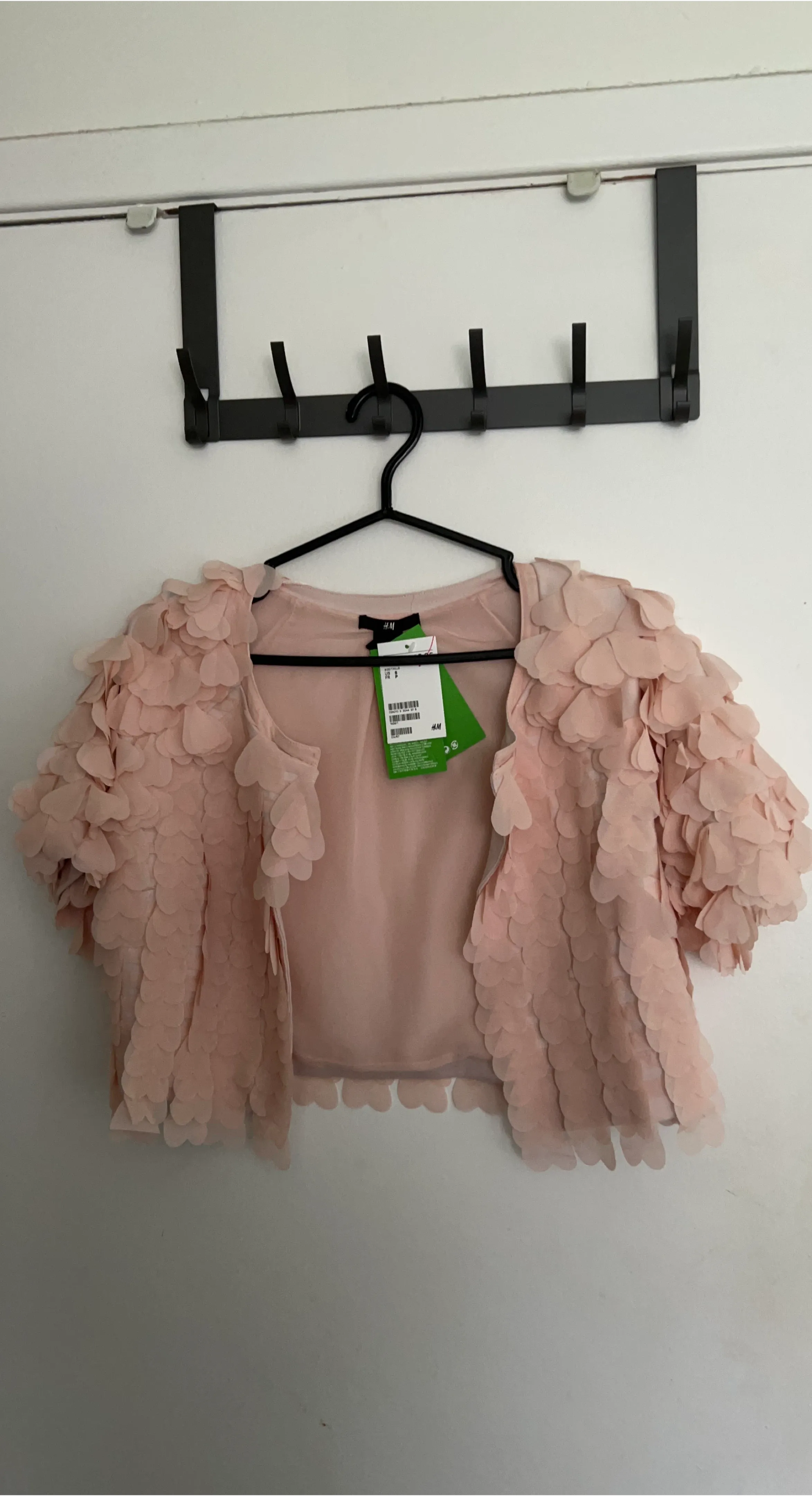 This H&M bolero jacket comes in a lovely pink colour with a unique petal-like embellishment all over. It's a size 34, perfect for layering over dresses or tops. It's a great statement piece for special occasions!