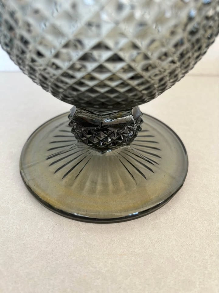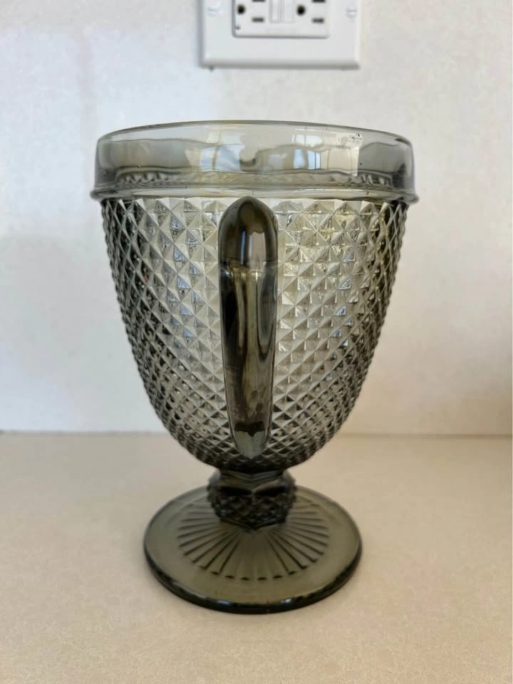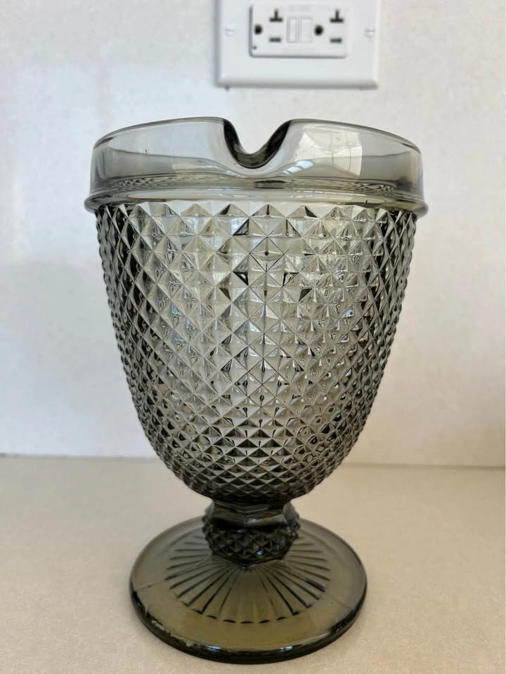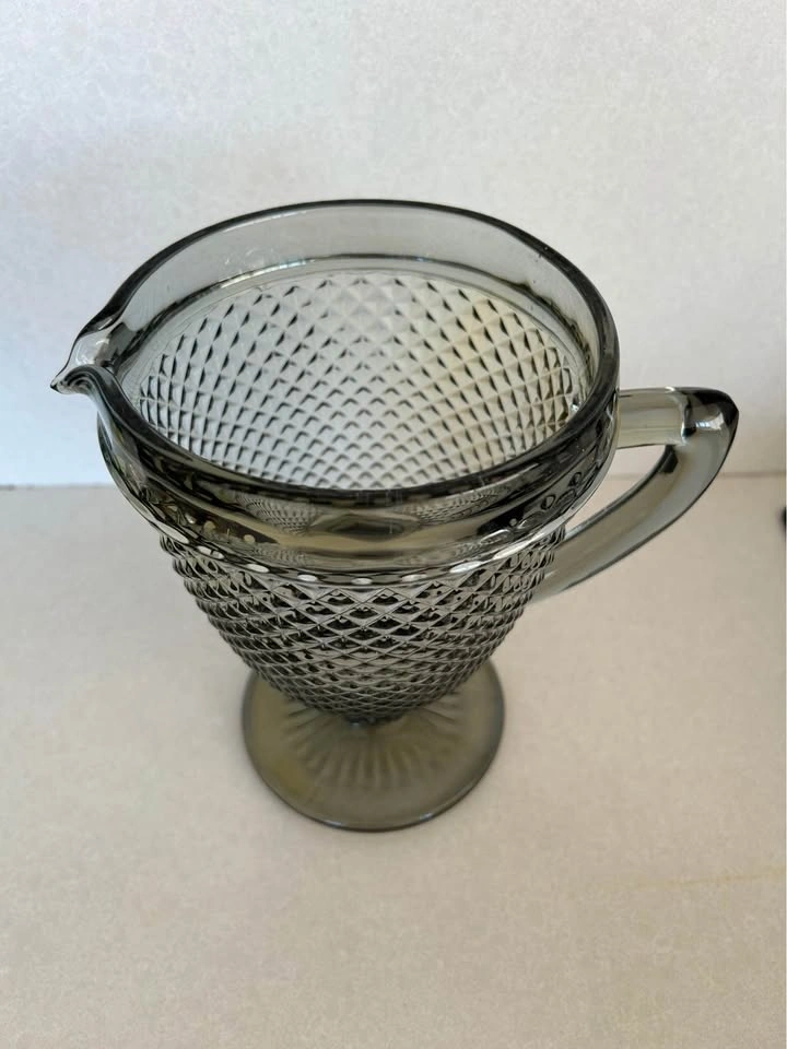 Vintage Stylish smoke gray glass pitcher with a cool diamond pattern texture. Features a handle and a nice pedestal base. Looks great for drinks or as decor. Holds 33 ounces (1 L) and is 8 inches tall.