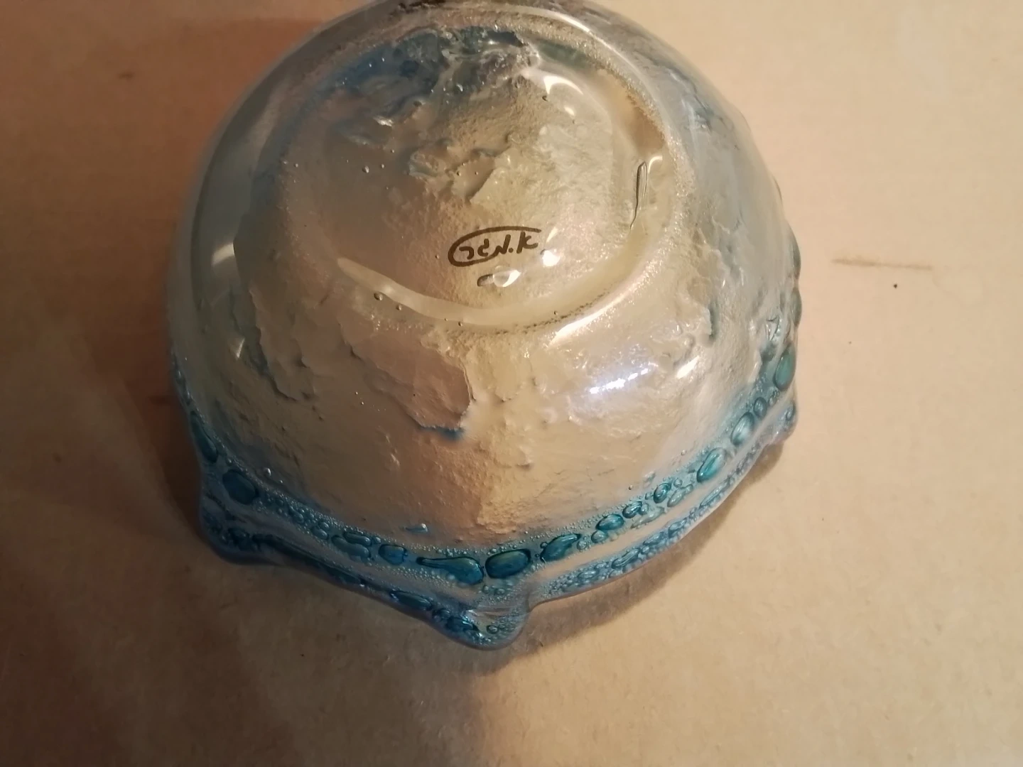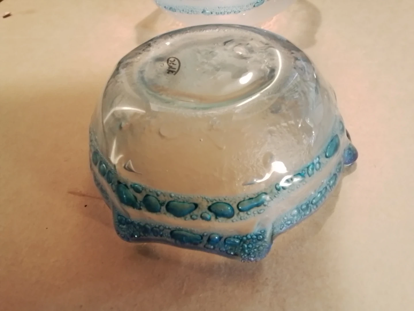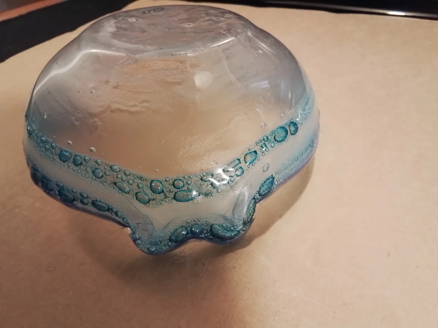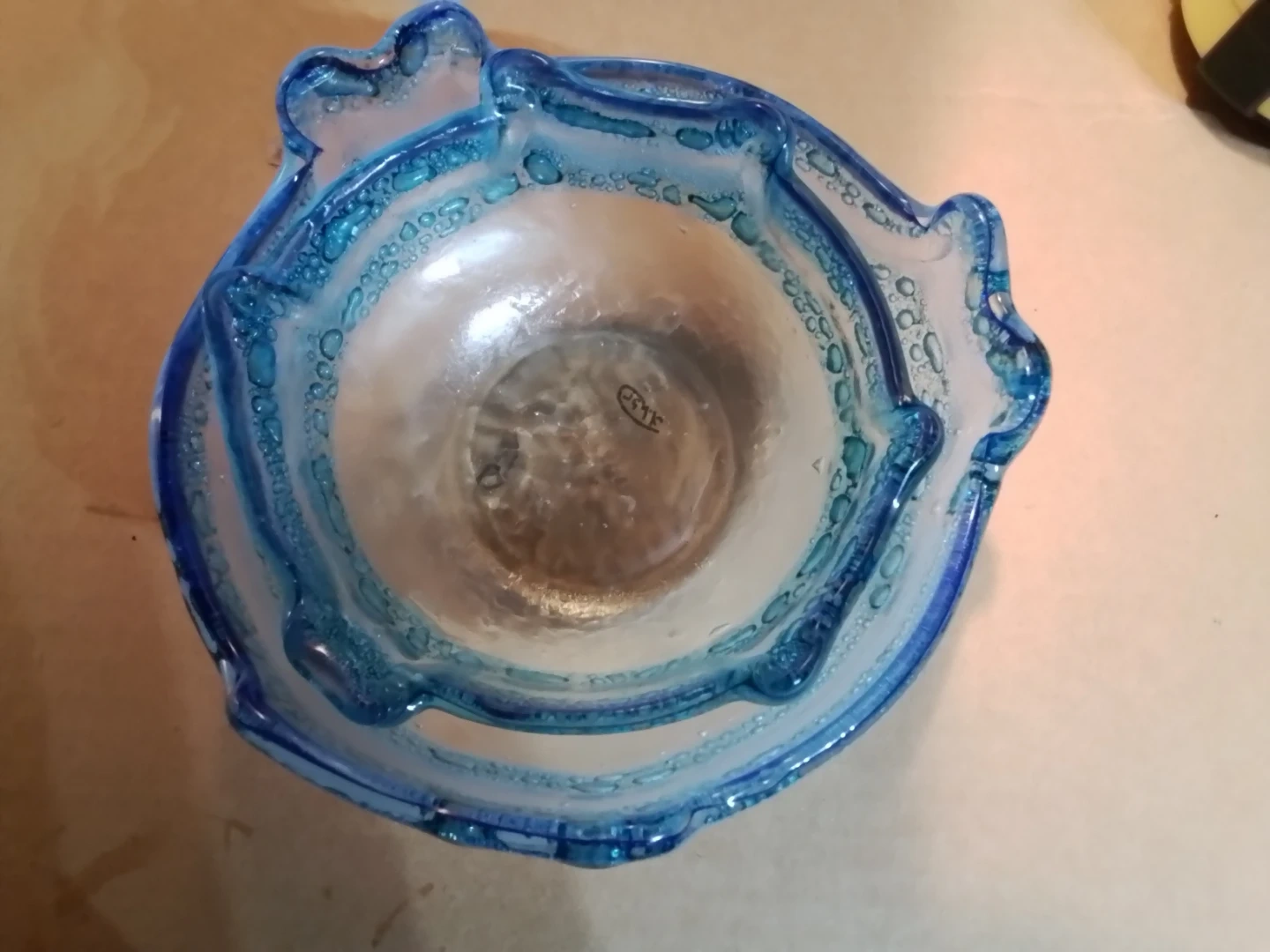 A decorative glass bowl with a blue and clear wavy rim. It has a unique, handmade look with small bubbles embedded in the glass. This piece would make a lovely centrepiece or candy dish.