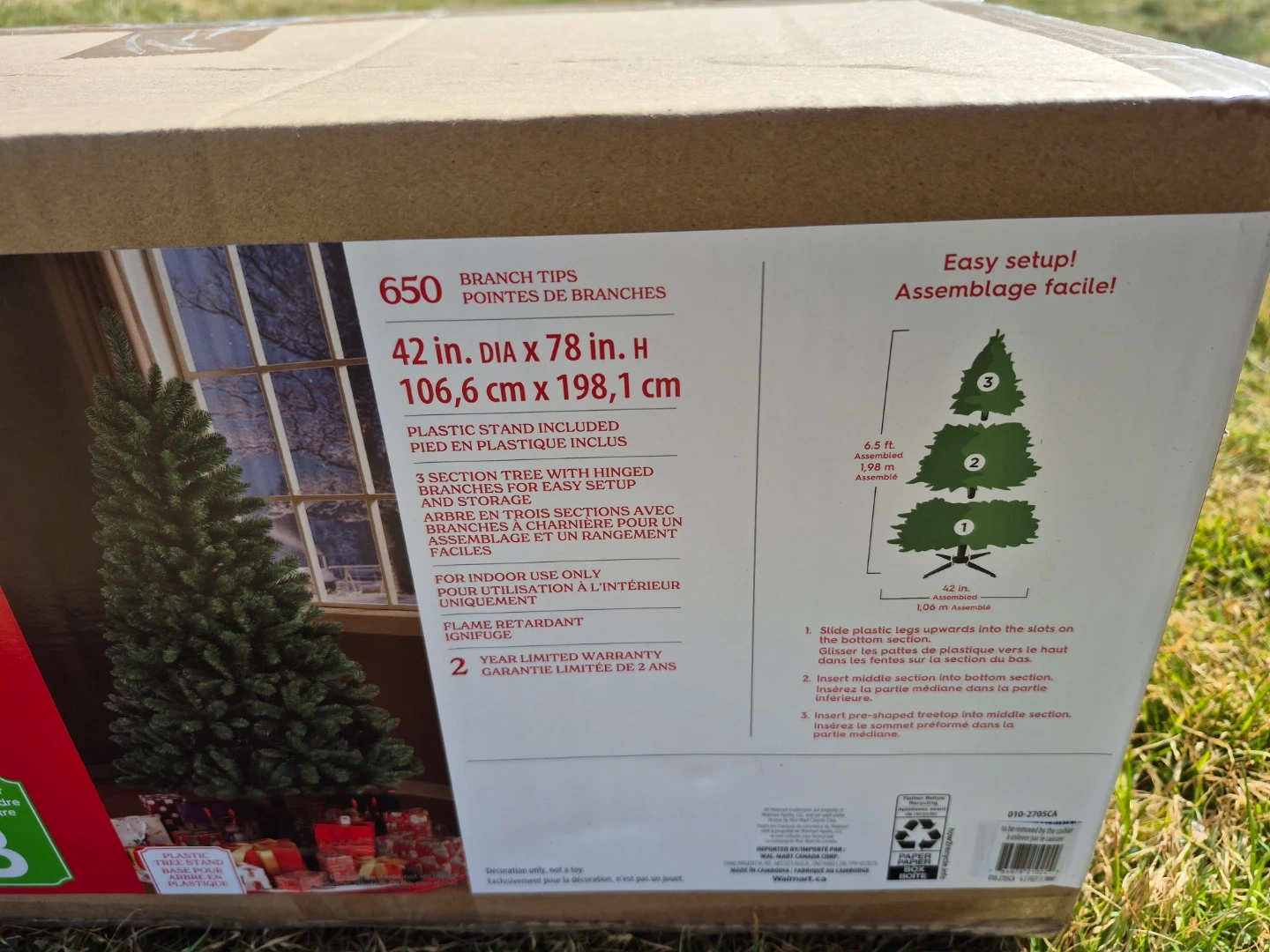 This Holiday Time artificial Christmas tree has 650 branch tips for a full look. It's a 3 section tree with hinged branches for easy setup and storage. The tree is designed for indoor use only. 7ft