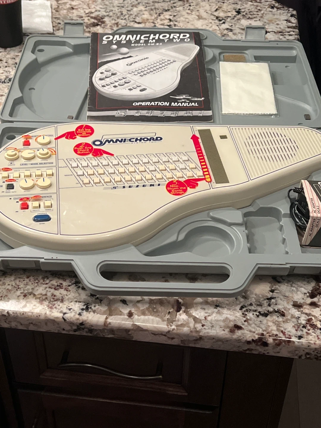 This is a Suzuki Omnichord System Two musical instrument. It features various chord buttons and controls for sound selection and volume. Includes an operation manual, cleaning cloth, carrying case and AC adapter.