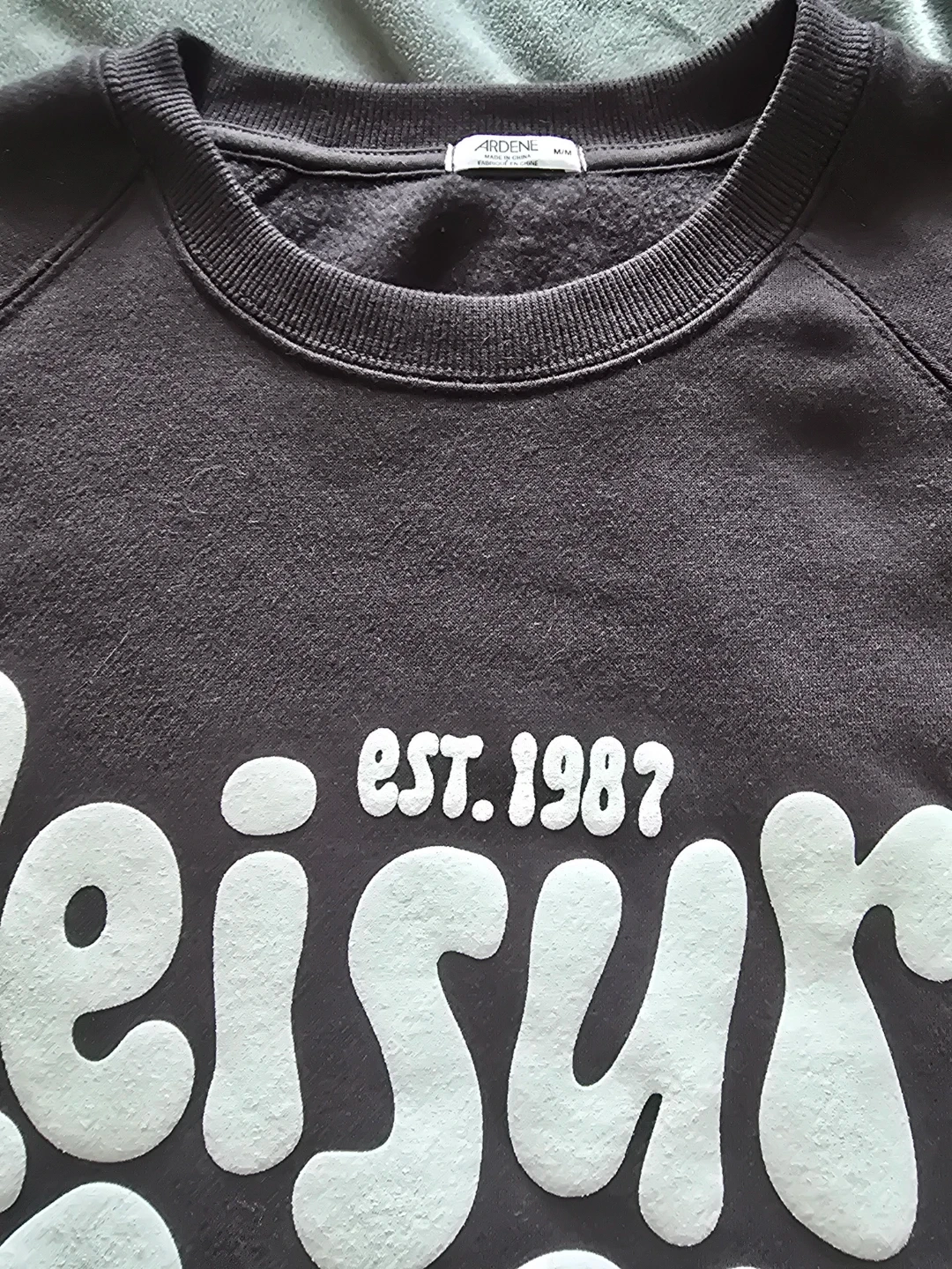 Grey Ardene sweatshirt with "Leisure Crew" graphic. It's a size M/M and features "est. 1987" and "Wellness at Our Core" text. This pullover style is comfortable and casual.