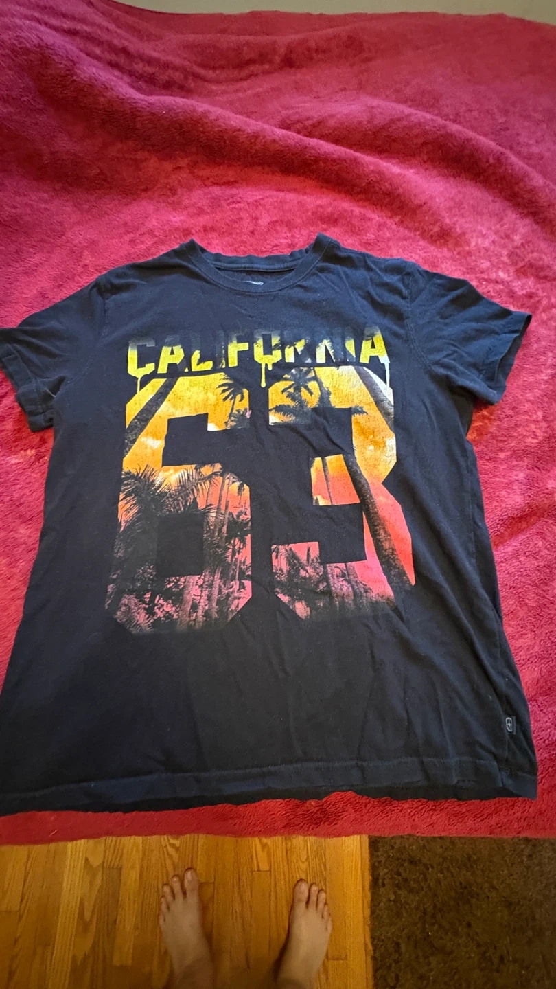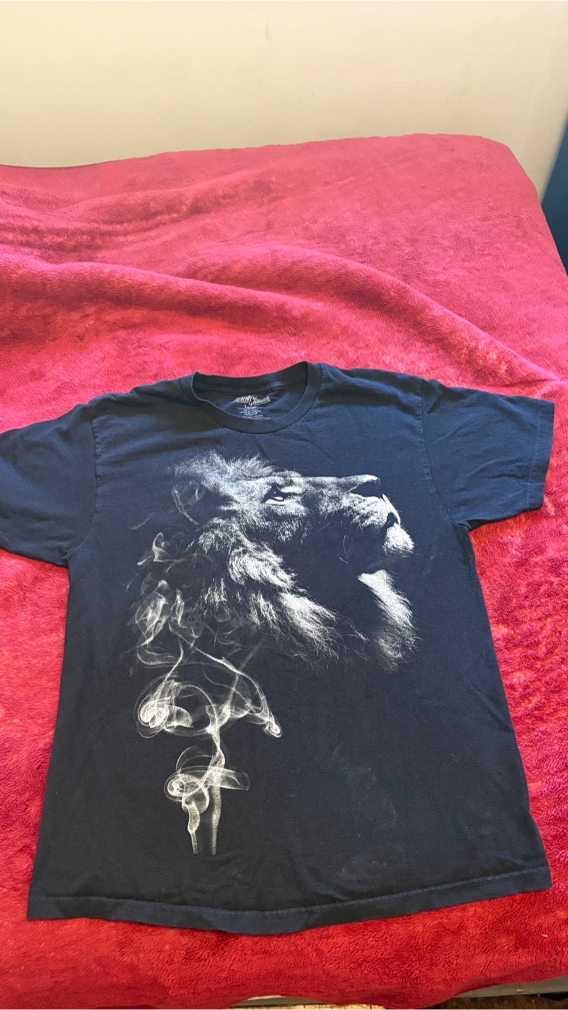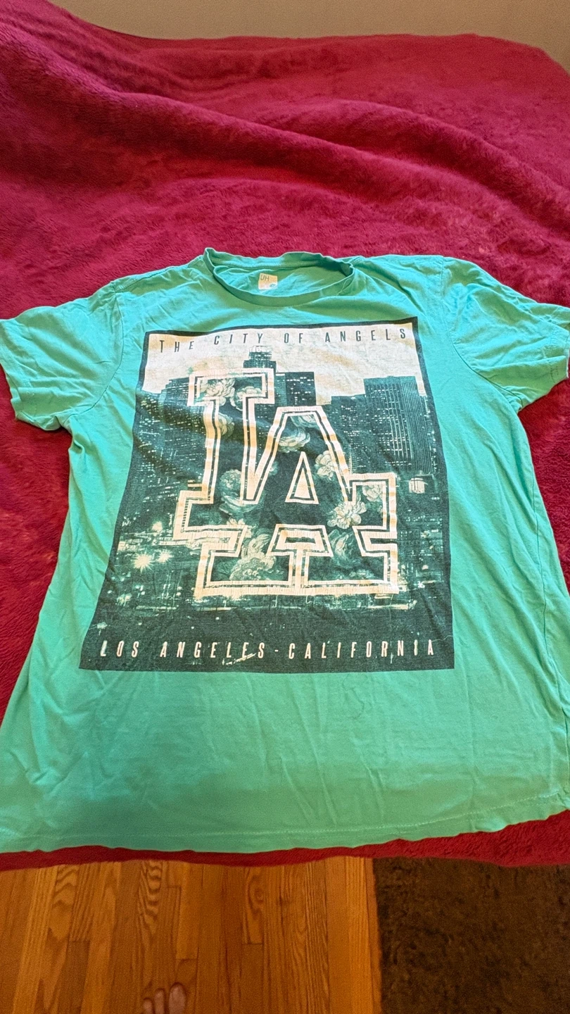 Selling a bundle of four men's graphic t-shirts in size large. Includes a black No Fear shirt, a black California 53 shirt, a teal City of Angels shirt, and a black lion shirt. All are in good condition!
