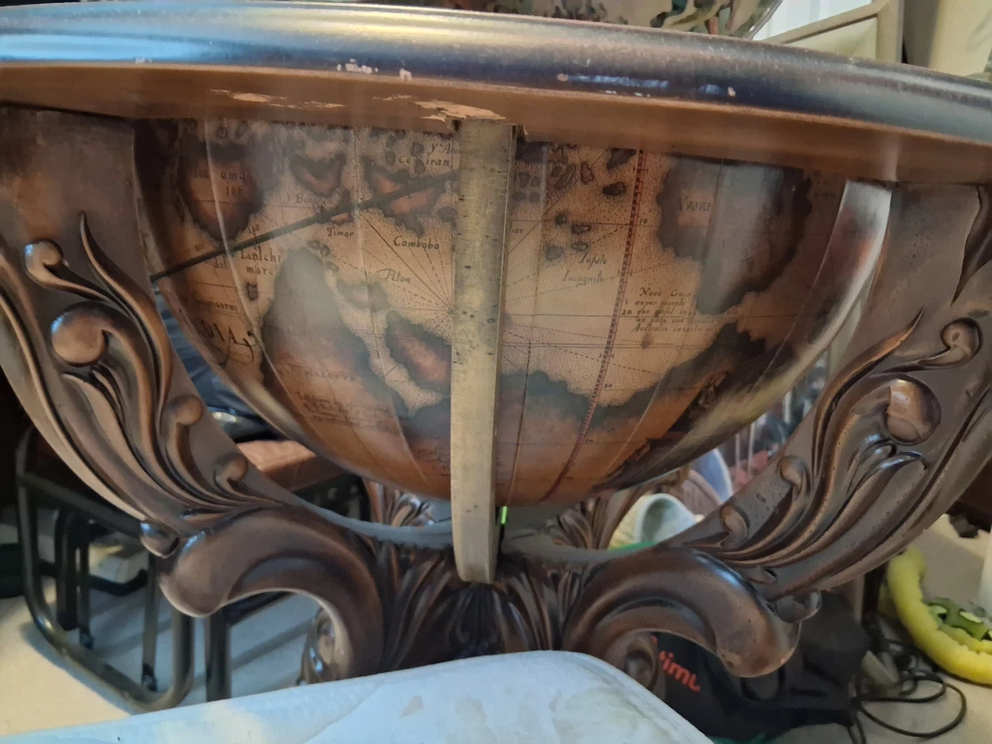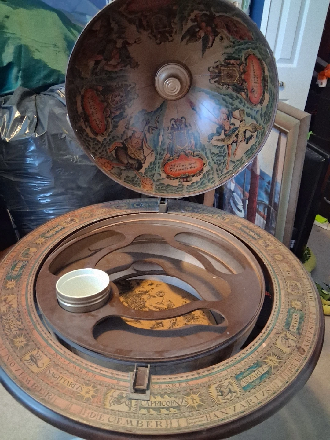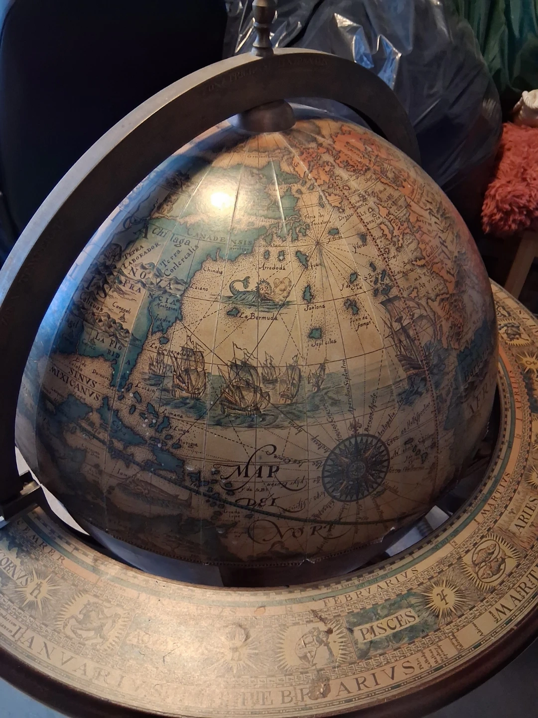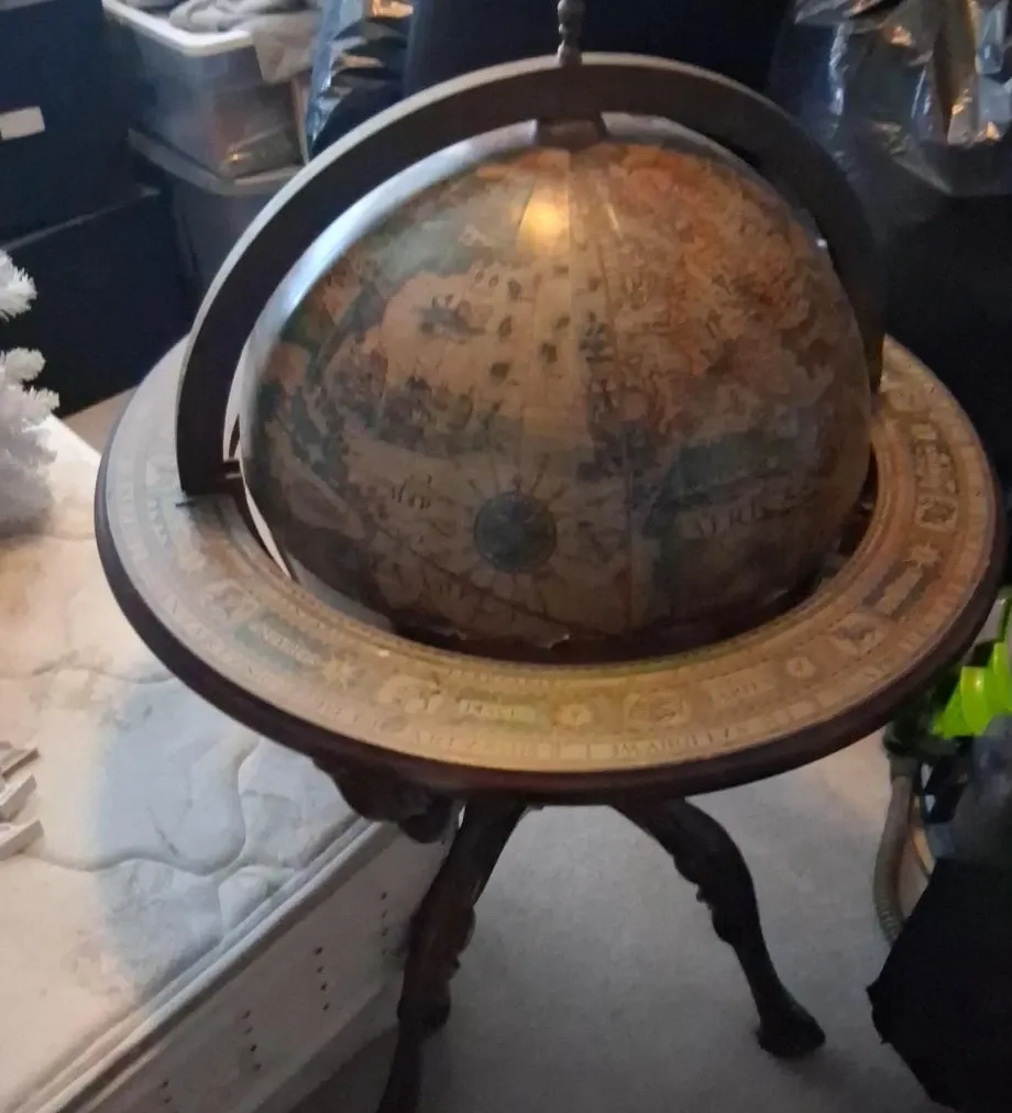 This is a vintage globe bar stand with a wooden base and a hinged globe that opens to reveal storage inside. It features intricate map details and zodiac signs around the base. Perfect for a study or living room!