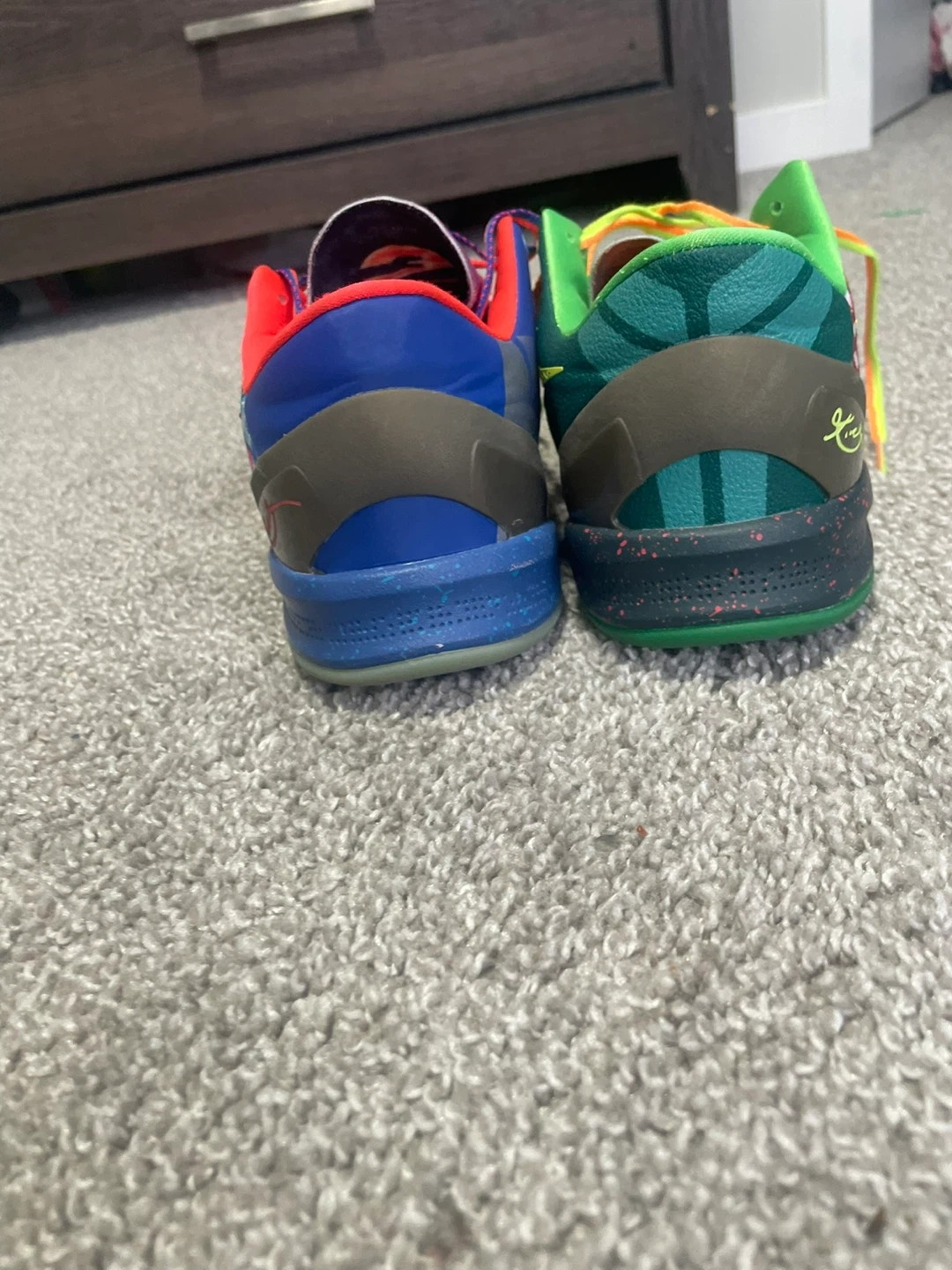 These Nike Kobe 8 "What The" sneakers feature a wild, mismatched design. They have colourful patterned uppers with red, blue, green, and yellow accents. The soles are green and speckled black. A true collector's item!