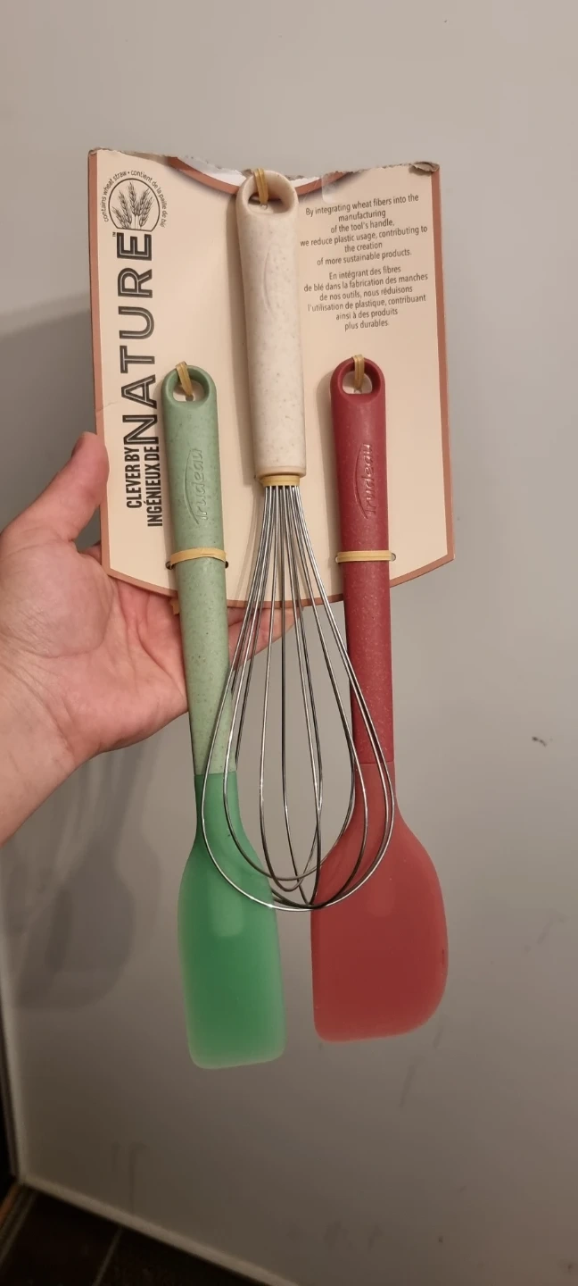 This Trudeau Nature set includes a whisk and two spatulas. The handles are made with wheat fibers, reducing plastic use for more sustainable products. Great for everyday kitchen tasks!