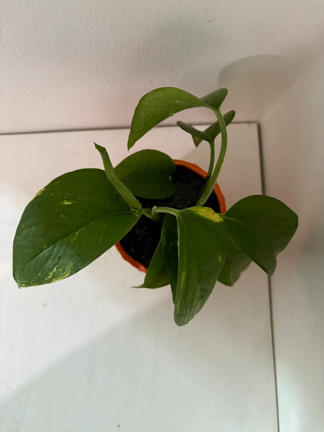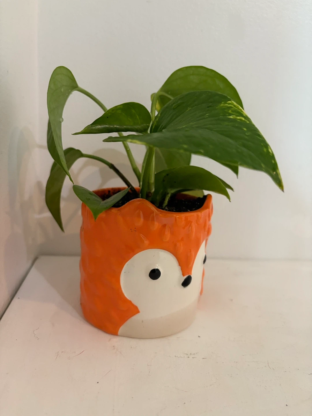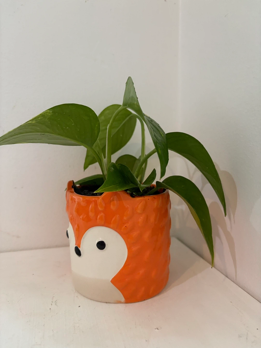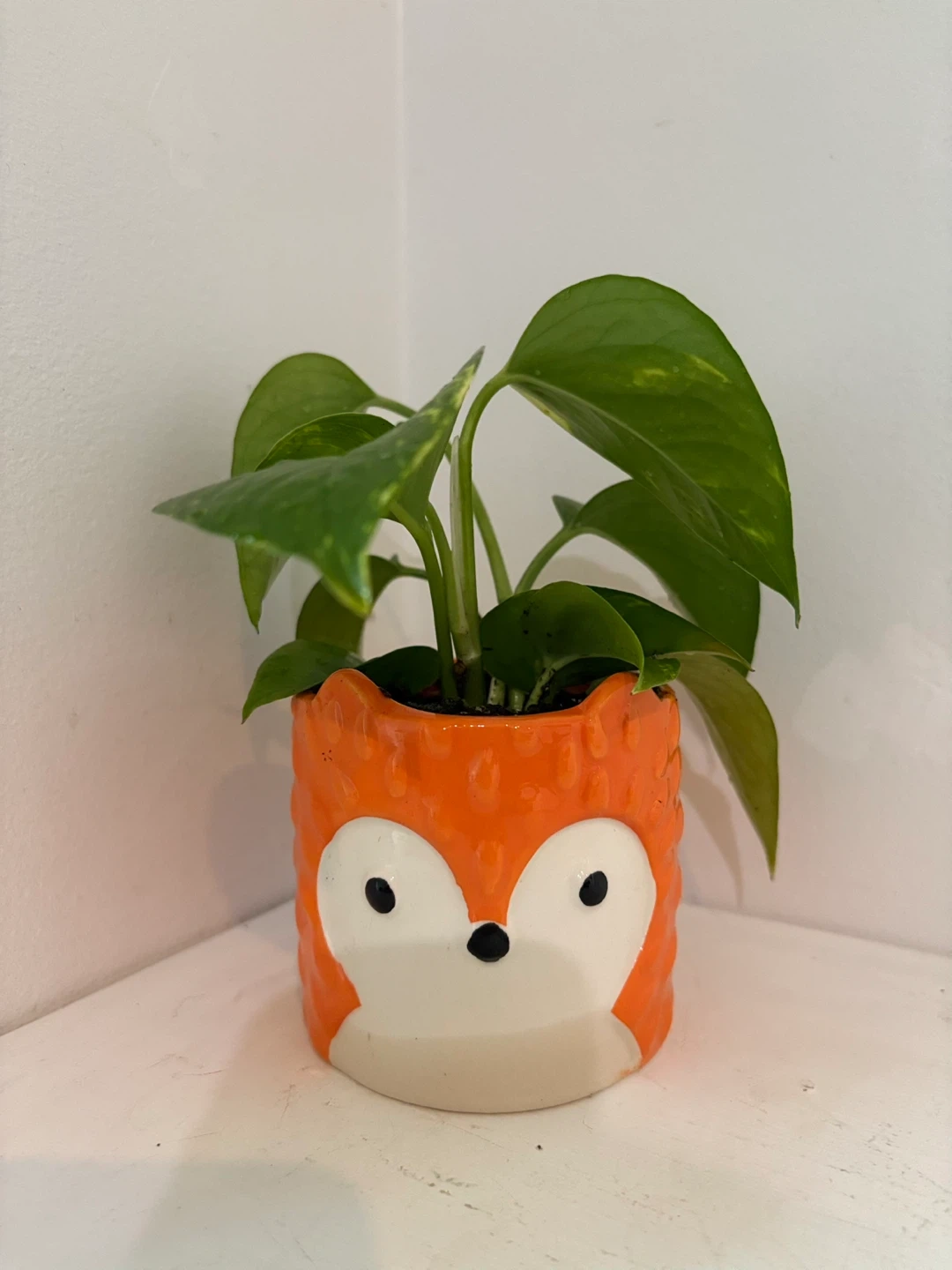 Healthy Pothos plant potted in a cute ceramic fox planter. It's an easy-care plant, great for adding some greenery to your space. Ceramic planter has a fun fox design.