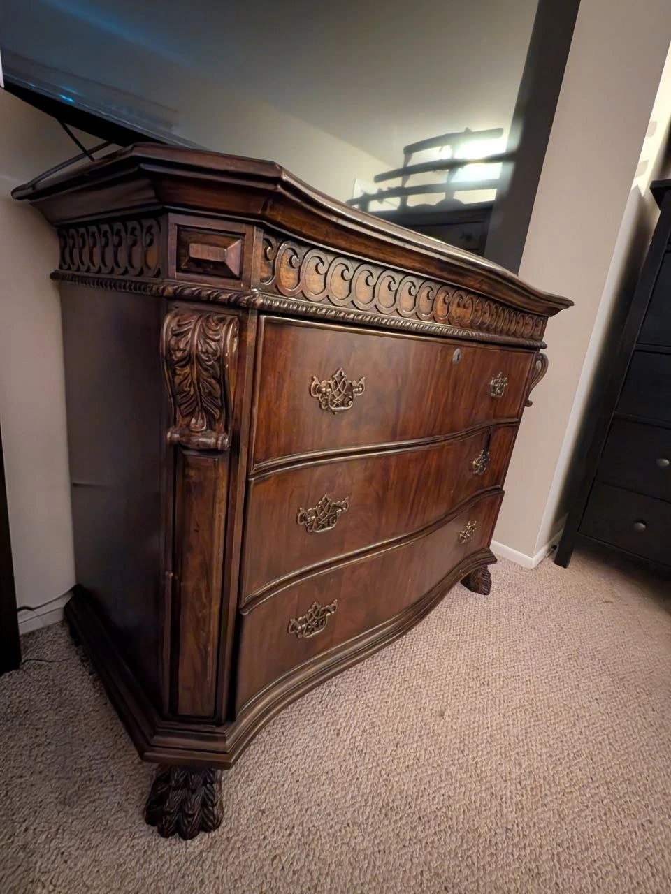 This is a vintage dresser with beautiful wood grain and ornate carved details. It features three spacious drawers with decorative brass pulls. The curved front and claw feet add to its classic charm.