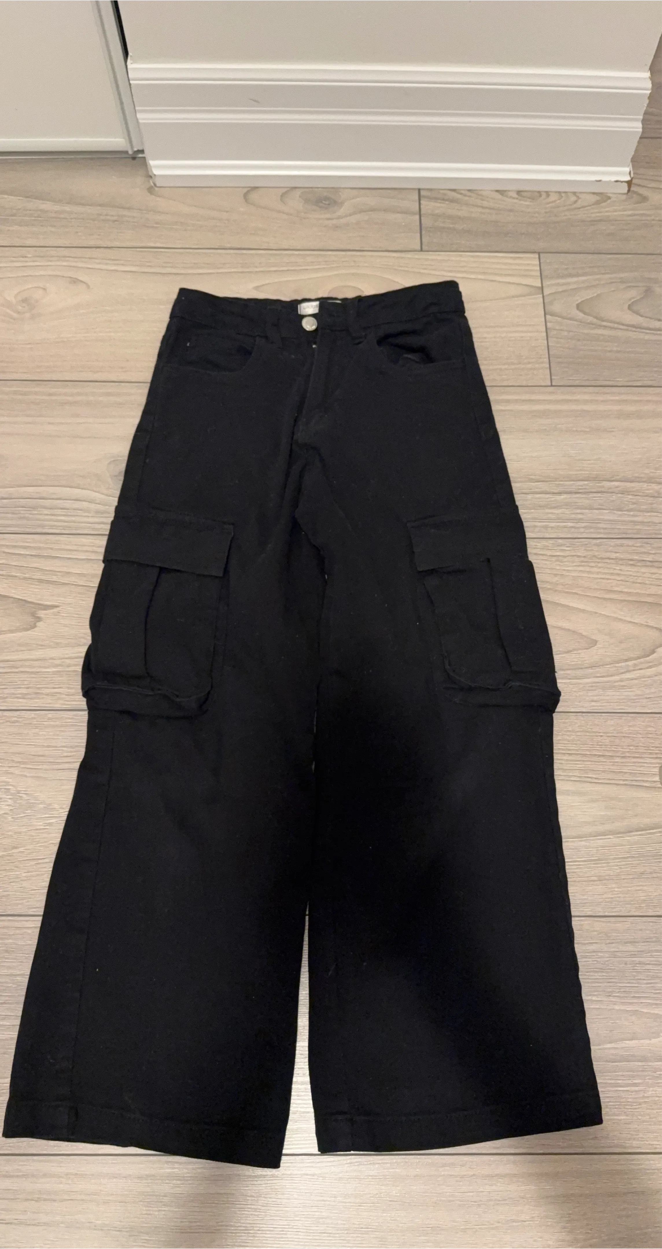 These black cargo pants feature a wide leg silhouette. They have multiple pockets for convenience. They're made for a casual style.