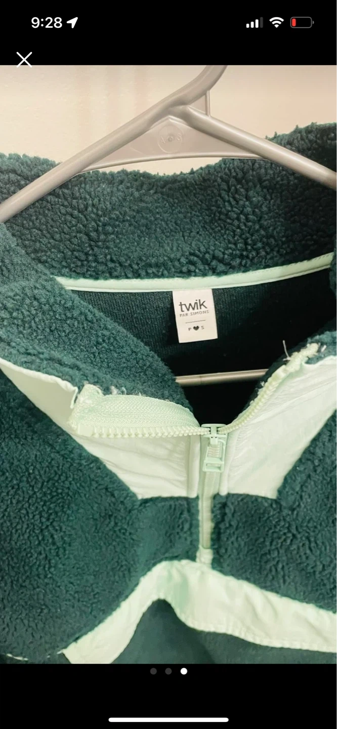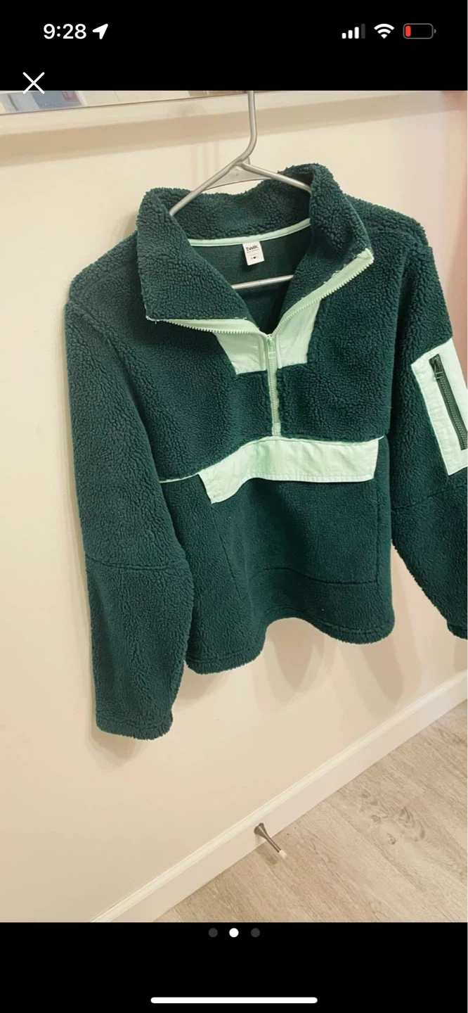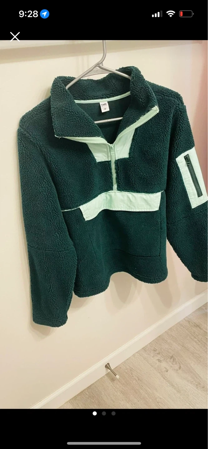 Cozy green fleece pullover with a light mint green accent. It features a quarter-zip closure and a zippered pocket on the sleeve. This pullover is size small and made of soft fleece material.