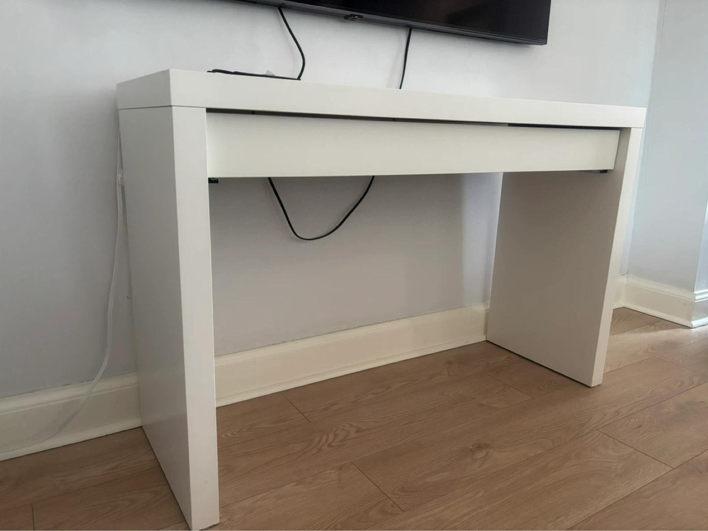 A simple white IKEA console table with a single drawer. Its clean lines make it a versatile piece for hallways or entryways or for a home office. Provides a convenient surface for keys or mail.