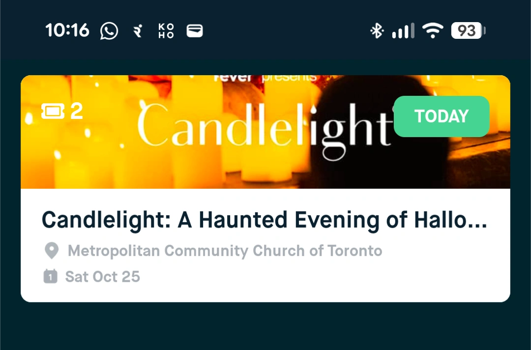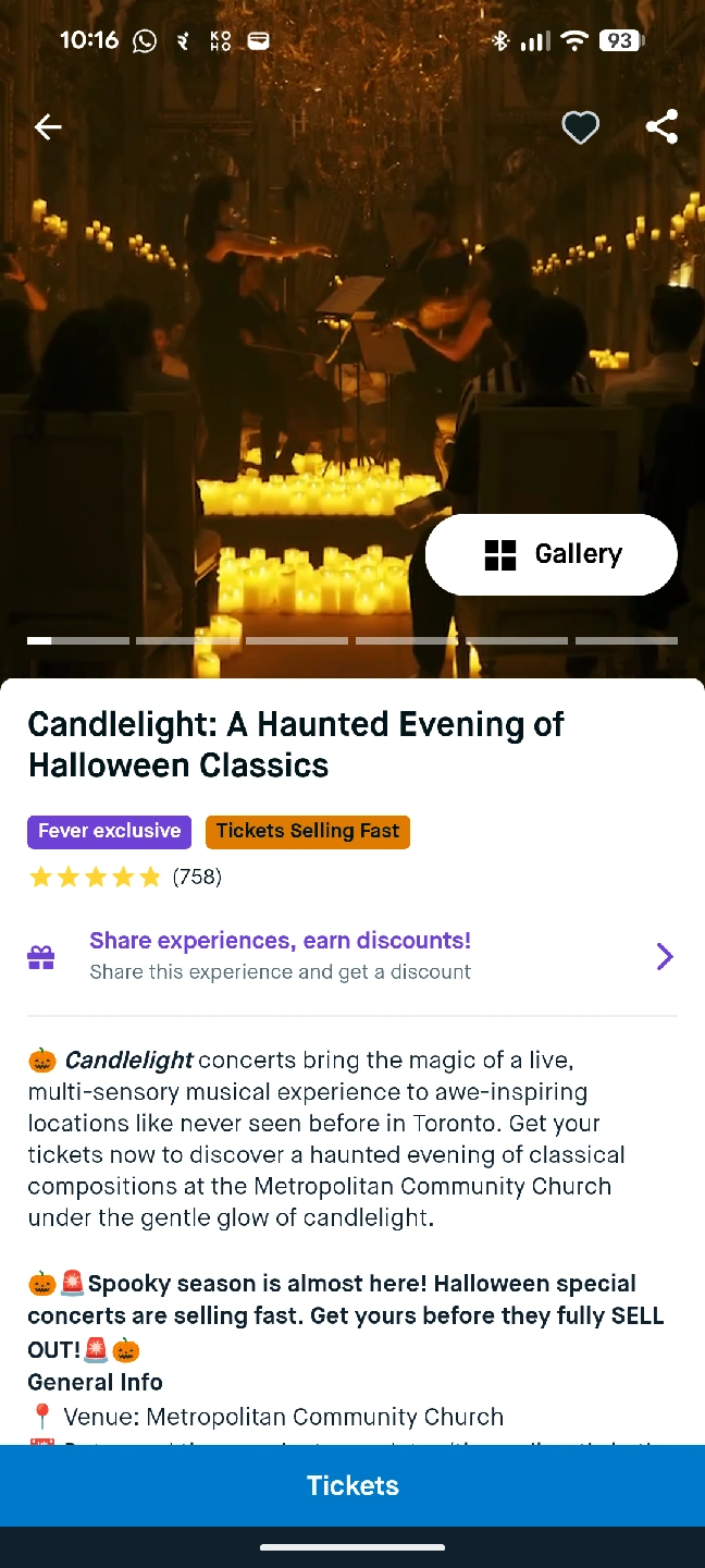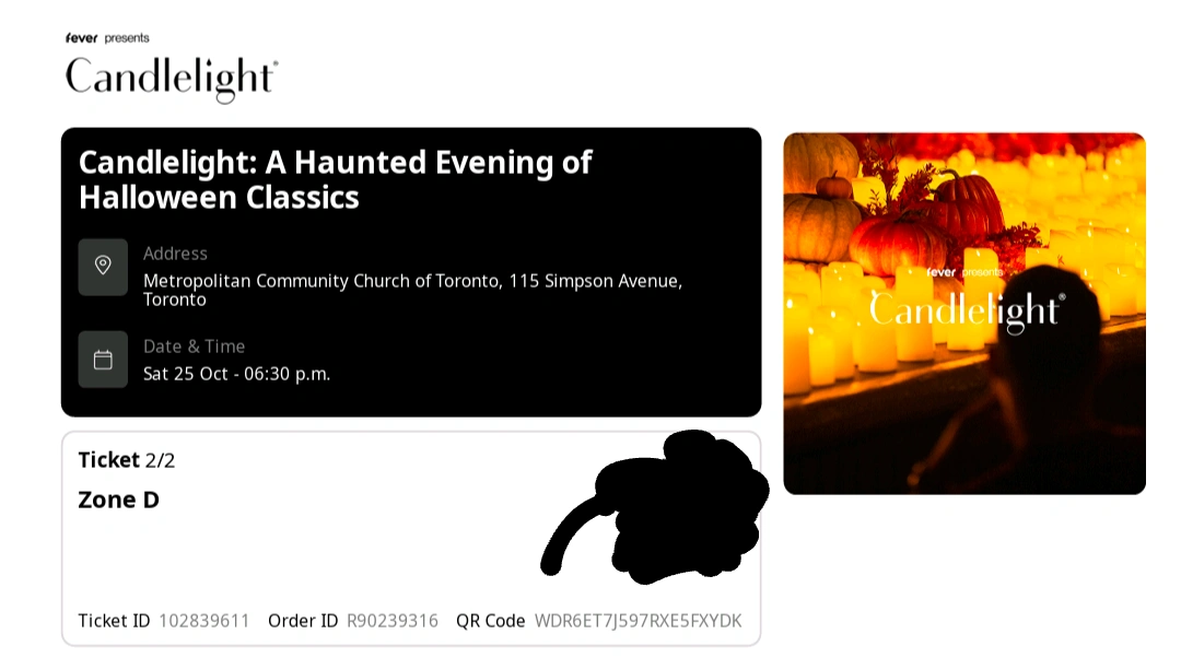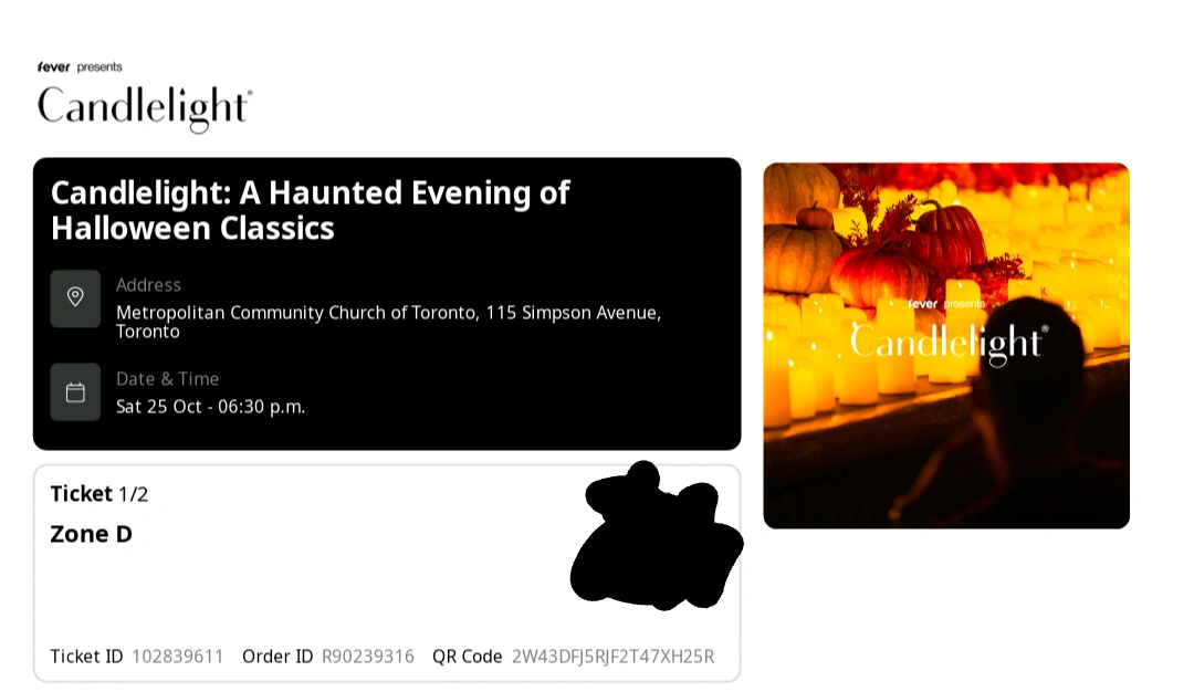 108Selling two tickets to Candlelight: A Haunted Evening of Halloween Classics. - Event is at the Metropolitan Community Church of Toronto, 115 Simpson Avenue, Toronto - Date: Saturday, October 25 @ 6:30pm - Zone D seating Selling at a 50% discount of what I paid originally.