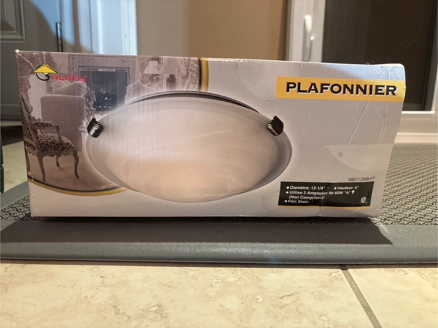 39Selling a Galaxy Plafonnier ceiling light still in its box! - Diameter: 12-1/4" - Height: 4" - Requires 2 x 60W "A" lightbulbs (not included) - Finish: Pewter