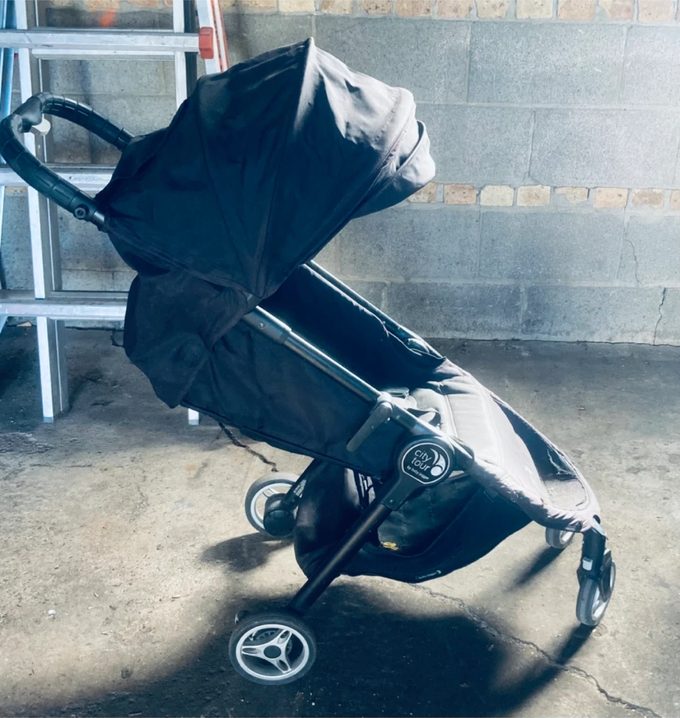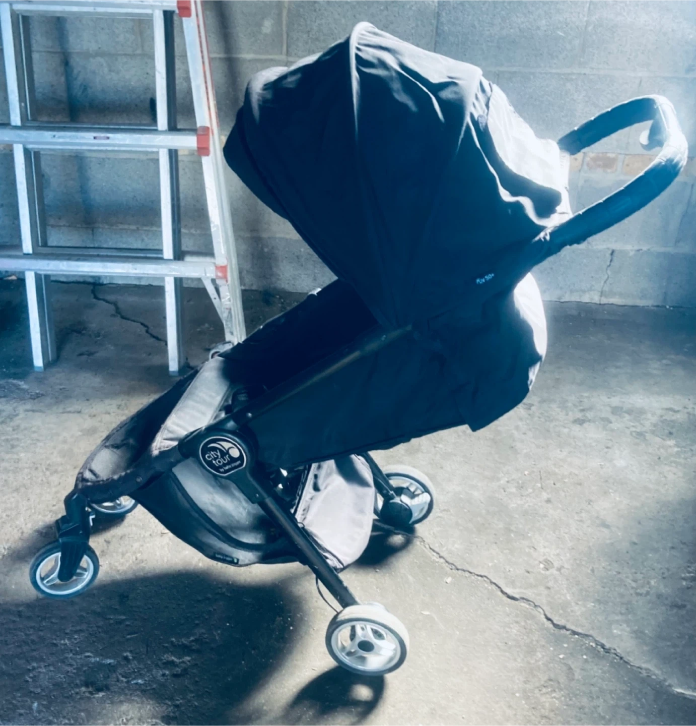 Black Baby Jogger City Tour LUX stroller. It's lightweight and folds compactly. Includes adjustable canopy and storage basket. A convenient stroller for travel! Open to trade looking for toddler bike trailer.