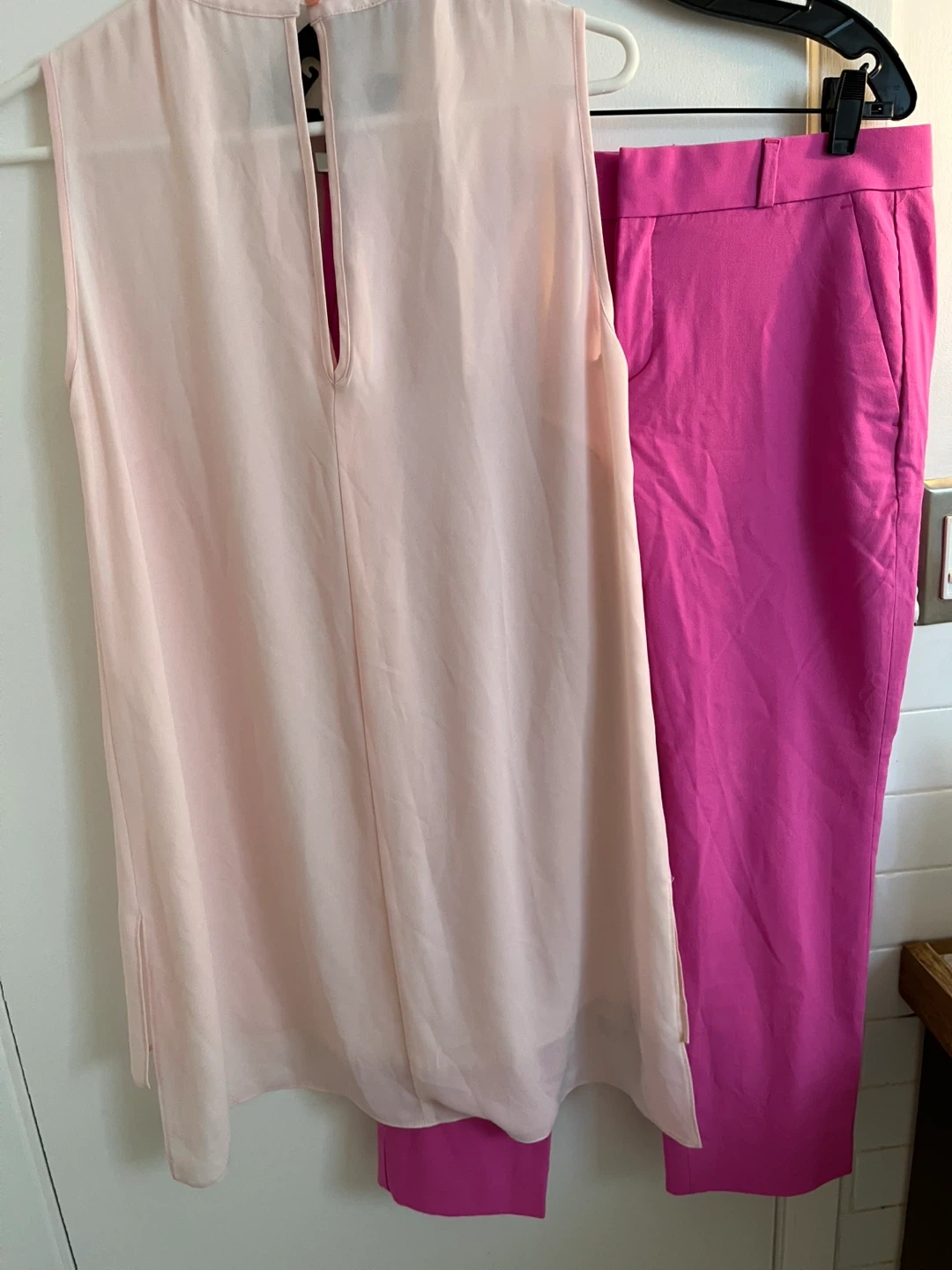 Pink top was a sample sale item. It is 18” pit to pit. Polyester
