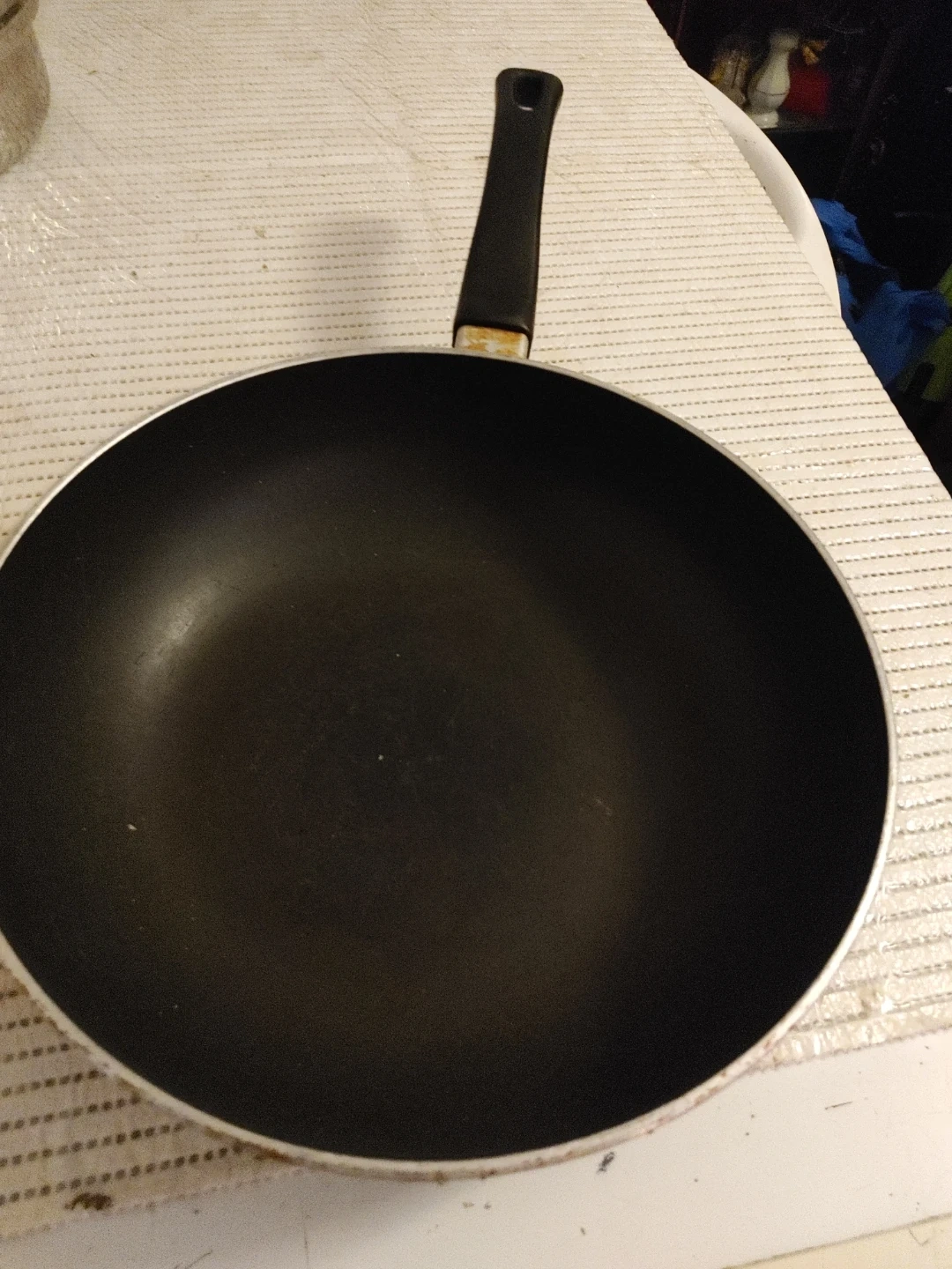 This is a Lagostina frying pan. It has a black non-stick interior and a black handle. The pan's exterior shows signs of wear but it's still functional. It's a handy size for everyday cooking.