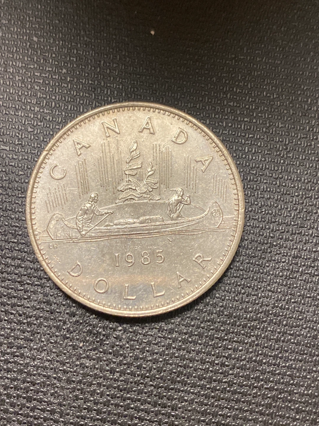 This is a 1985 Canadian dollar coin featuring Queen Elizabeth II on one side and a canoe scene on the other. It's a unique piece of Canadian currency.