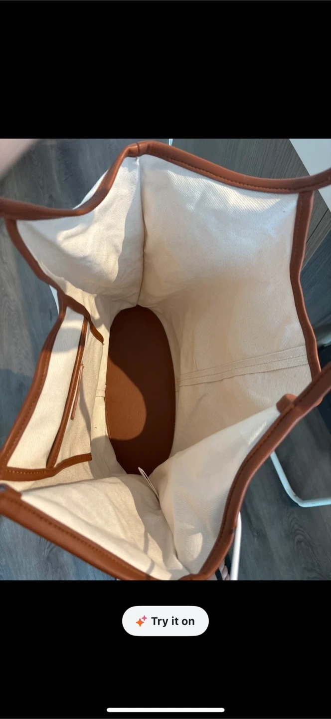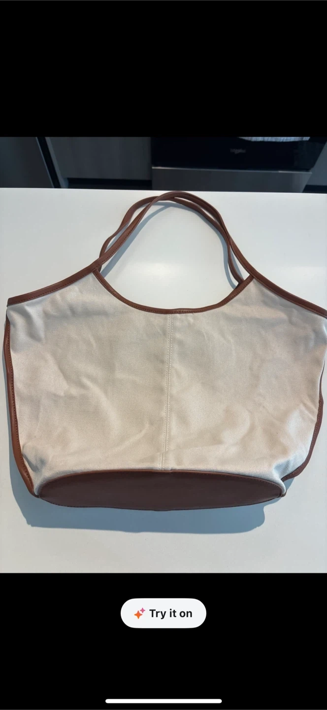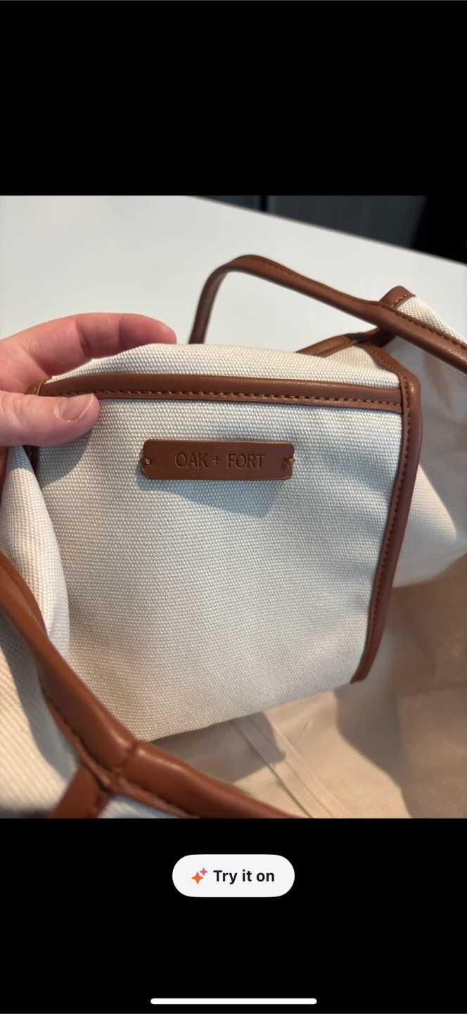 Re selling from Karrot . A versatile canvas tote bag from OAK + FORT. It features a durable canvas exterior with faux leather trim and handles. This bag has a roomy interior with a small pocket.