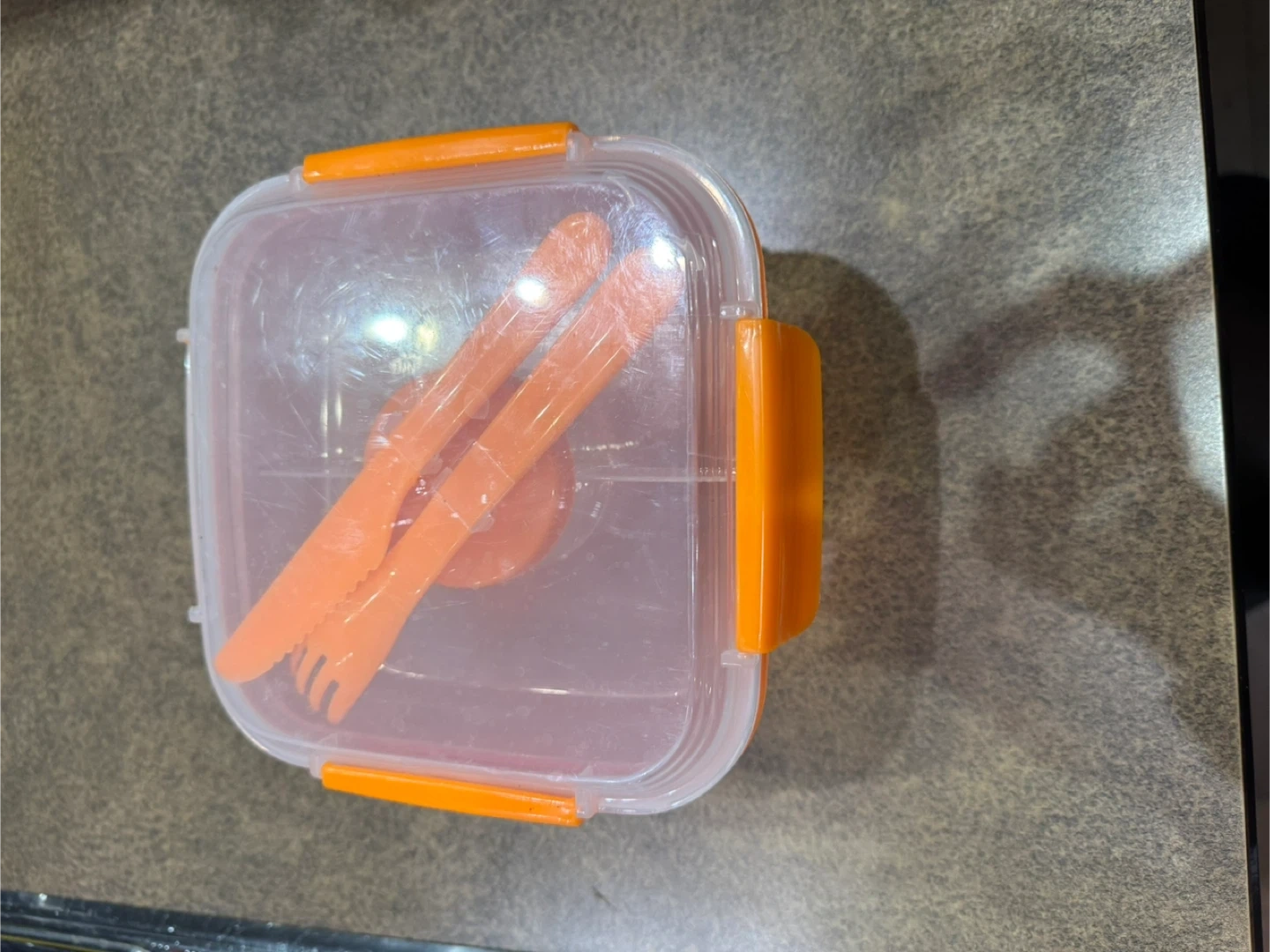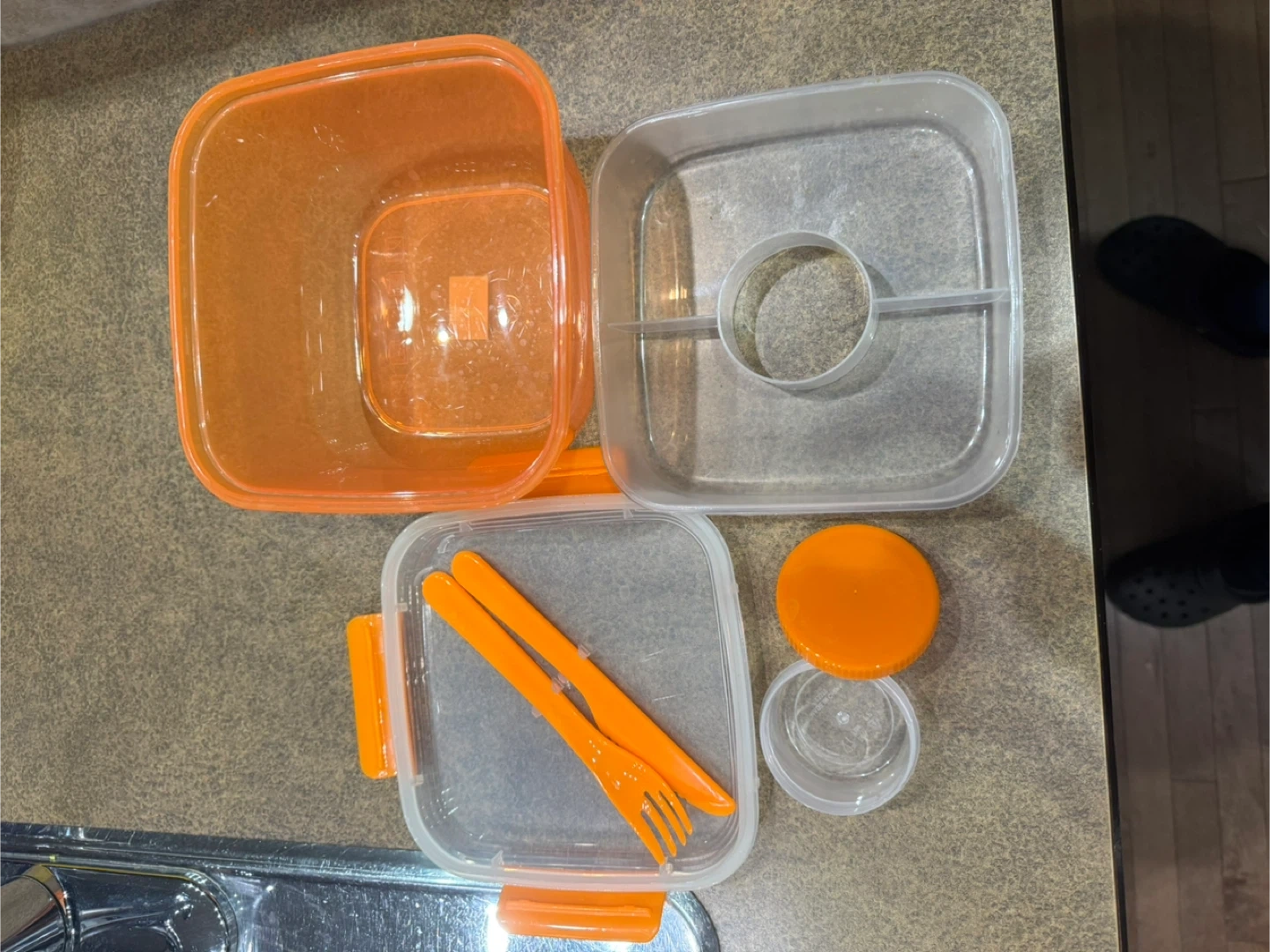 Comes with water bottle and another container great for a salad it comes with a knife and fork