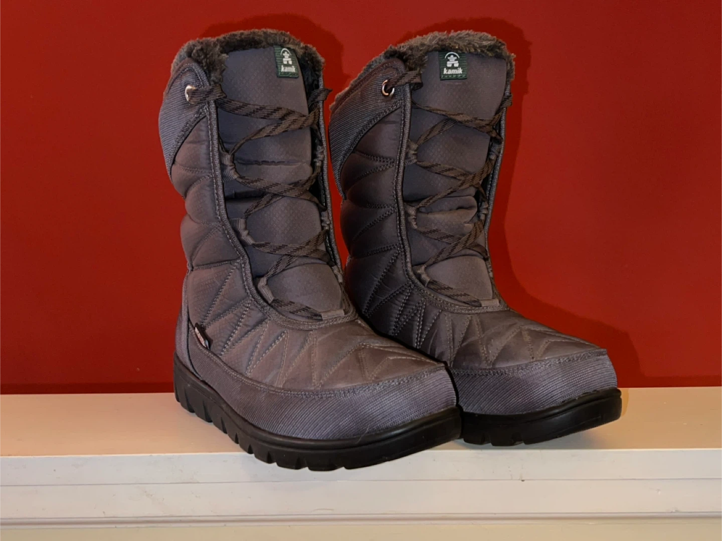 Like new! Cozy and warm Kamik winter boots in a stylish grey colour. These boots will keep your feet snug and dry.