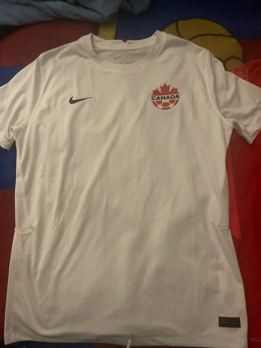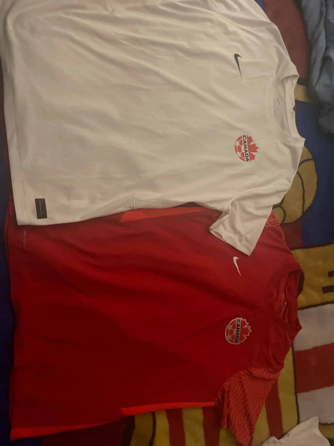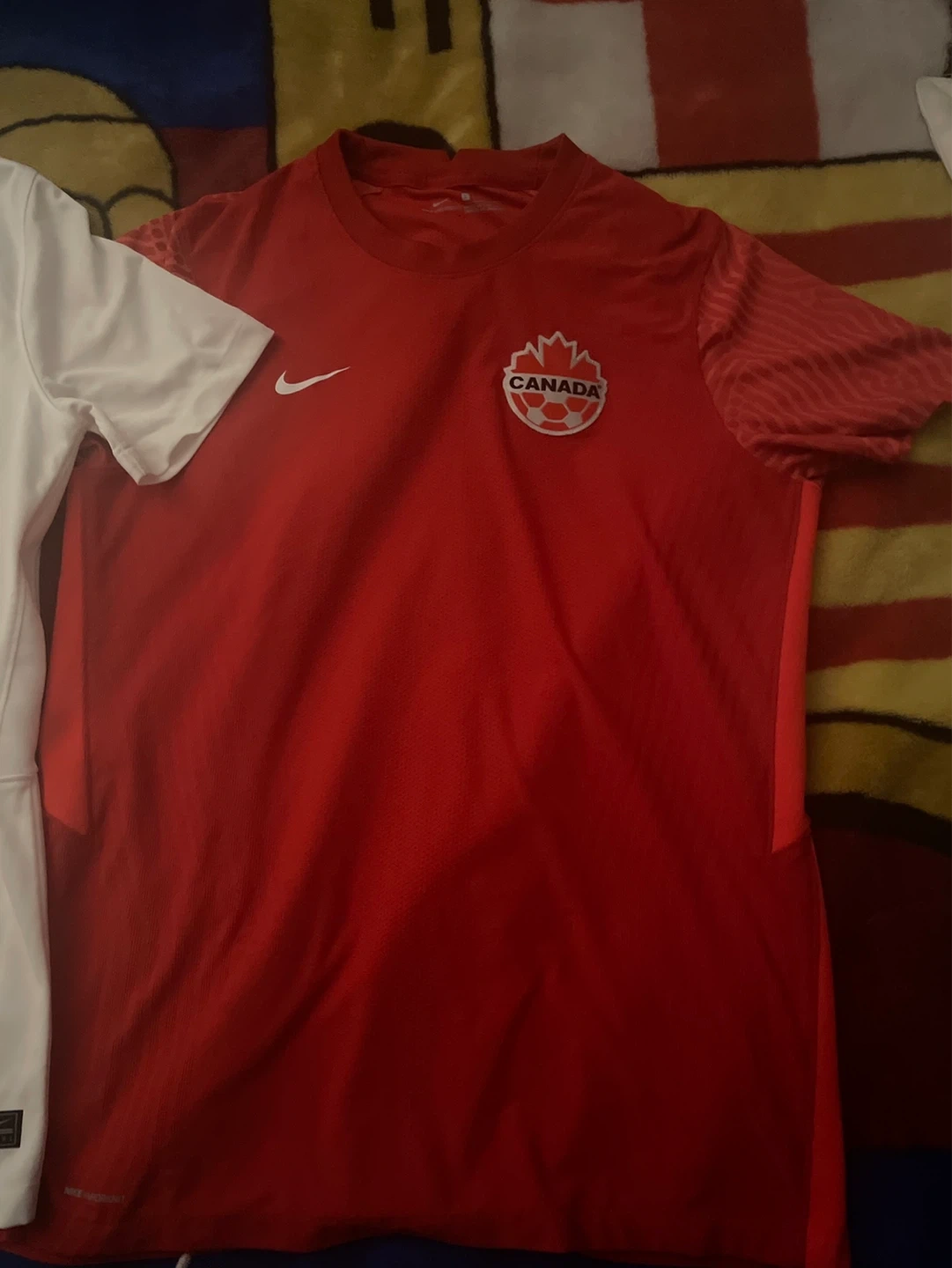 This is a Nike VaporKnit soccer jersey with the Canada crest. It's made in Thailand and designed for performance. It's a size Large. The red one is $45 the white is $40. For both tho it’s $80.