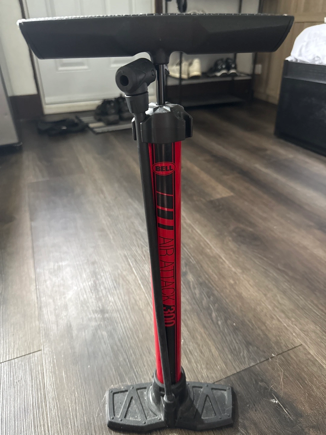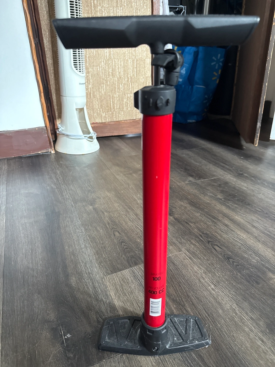 Offering a bike pump. It is red and black in colour. Includes a handle and a foot base. A great way to keep your tires in tip-top shape. ONLY PICK UP
