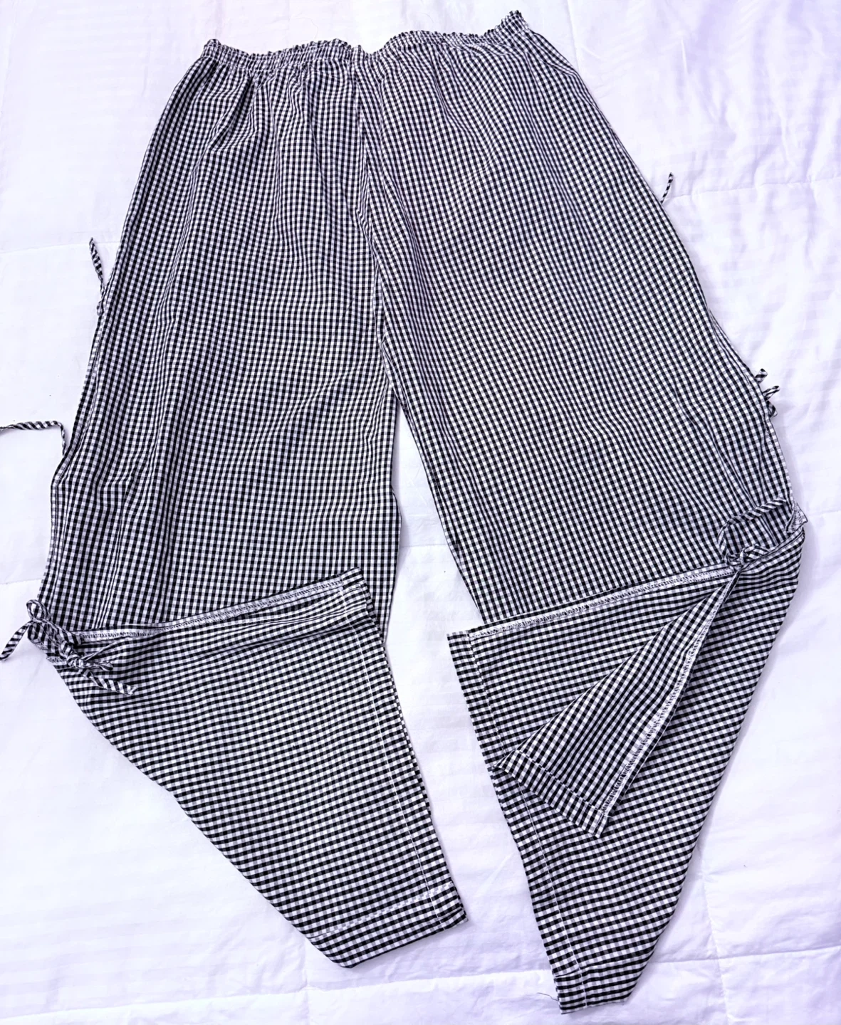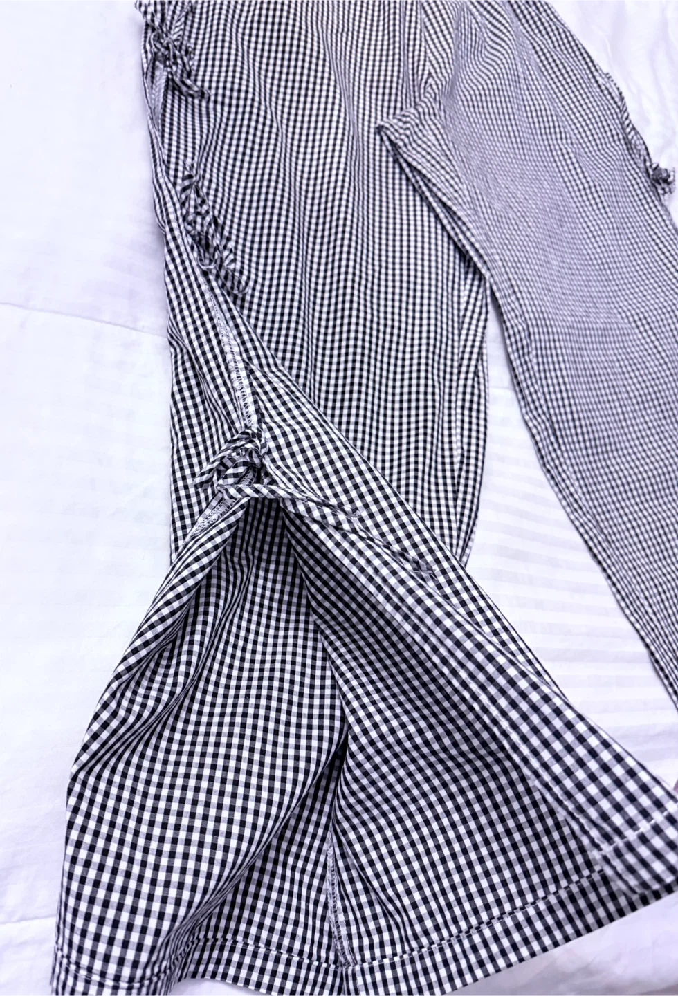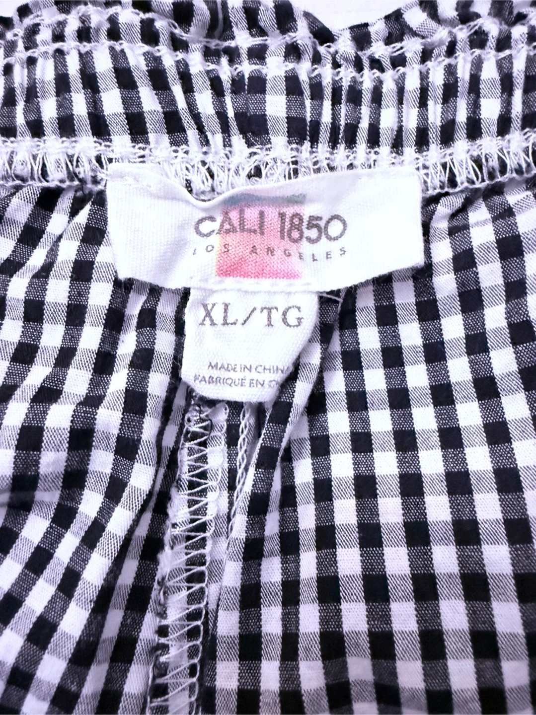 Cute Cali 1850 gingham pants with tie details on the sides! They're a size small and have a wide leg fit. The black and white pattern is super trendy and would be a great addition to your wardrobe.