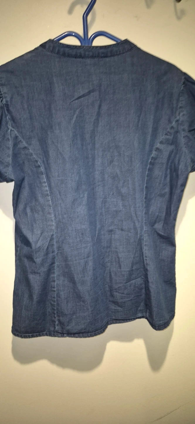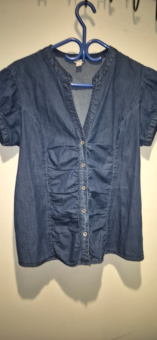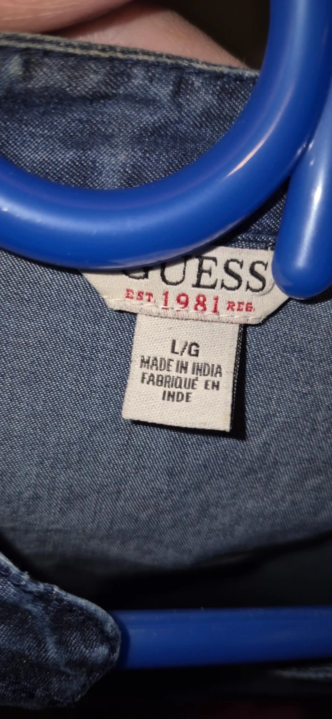 This is a Guess denim shirt in a size L/G. It's made from cotton. The shirt has a button-up front with ruched detailing. It's a great casual top!